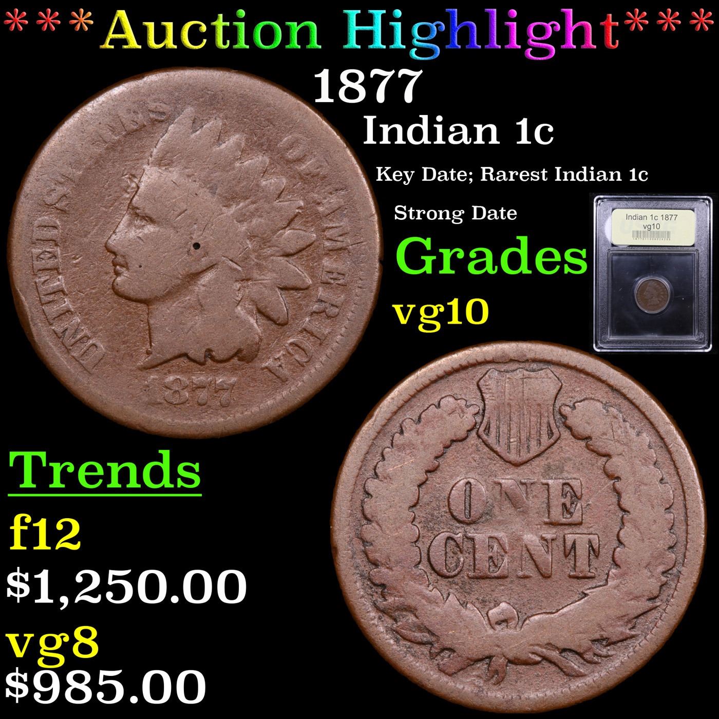***Auction Highlight*** 1877 Indian Cent 1c Graded vg+ By USCG. The Key Date to the whole Indian Cent Series. According to Jaime Hernandez from PCGS, ‘The 1877 Indian Cent is unquestionably the most desirable coin in the entire circulation strike Indian Cent series. It is the second lowest mintage coin in the series, and only the 1909-S Indian cent has a lower mintage. Despite the 1877 Indian cent having the second lowest mintage in the series, it also survives in much smaller numbers than the 1909-S Indian cent. This is mainly due to the lack of coins being collected in 1877 compared to 1909. There is only one reverse die confirmed as striking all existing 1877 Indian cents. However, if there was only one reverse die employed to strike all (877,000)1877 Indian cents, then this lone die should have sustained major planchet flaws when striking such a large mintage. Surprisingly, this is not the case since 1877 cents show no traces of a damaged die. Therefore, it is strongly believed that the mintage of 877,000 coins struck, is actually a highly inflated figure. A Corey's Pick, Bid to Win, Don't let it get Away Coin