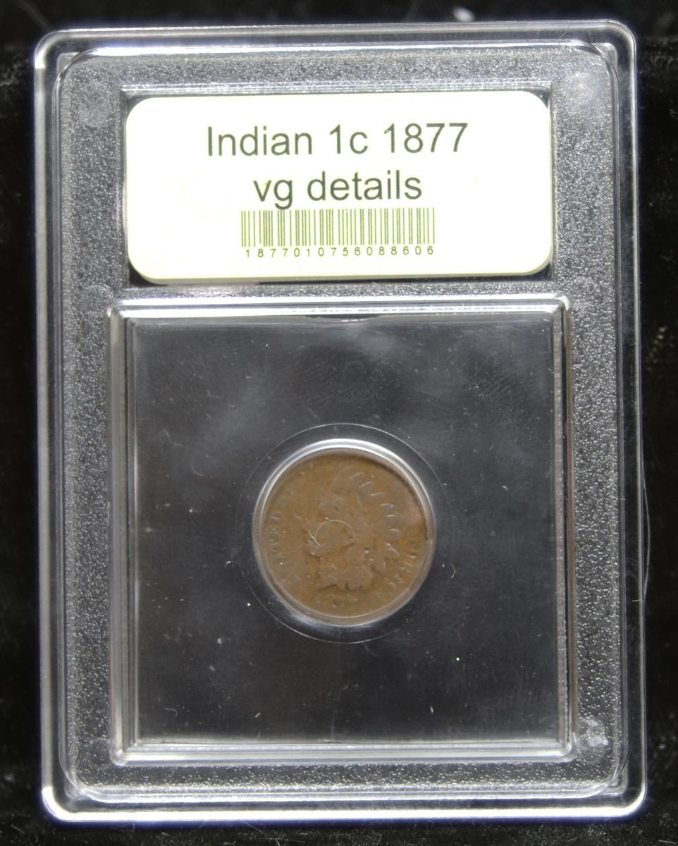 ***Auction Highlight*** 1877 Key Date; Rarest Indian 1c . Indian Cent 1c Graded vg details By USCG. The Key Date to the whole Indian Cent Series. According to Jaime Hernandez from PCGS, ‘The 1877 Indian Cent is unquestionably the most desirable coin in the entire circulation strike Indian Cent series. It is the second lowest mintage coin in the series, and only the 1909-S Indian cent has a lower mintage. Despite the 1877 Indian cent having the second lowest mintage in the series, it also survives in much smaller numbers than the 1909-S Indian cent. This is mainly due to the lack of coins being collected in 1877 compared to 1909. There is only one reverse die confirmed as striking all existing 1877 Indian cents. However, if there was only one reverse die employed to strike all (877,000)1877 Indian cents, then this lone die should have sustained major planchet flaws when striking such a large mintage. Surprisingly, this is not the case since 1877 cents show no traces of a damaged die. Therefore, it is strongly believed that the mintage of 877,000 coins struck, is actually a highly inflated figure.