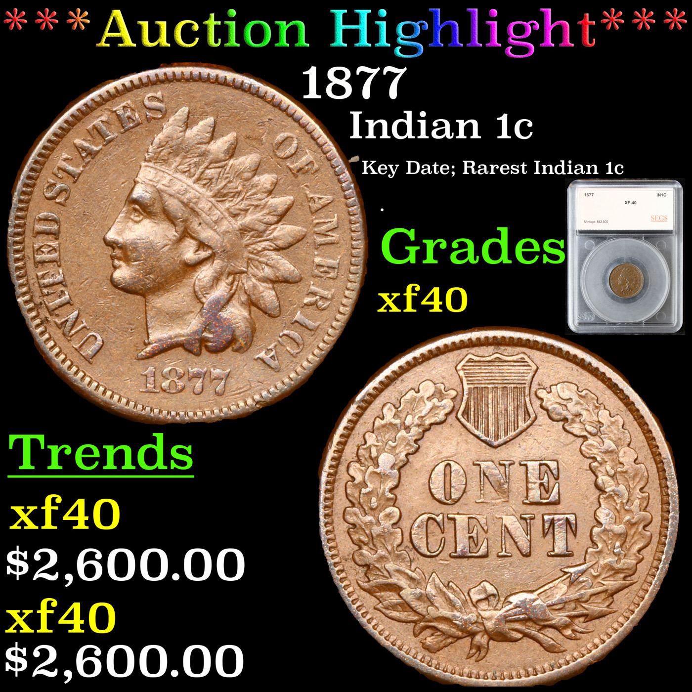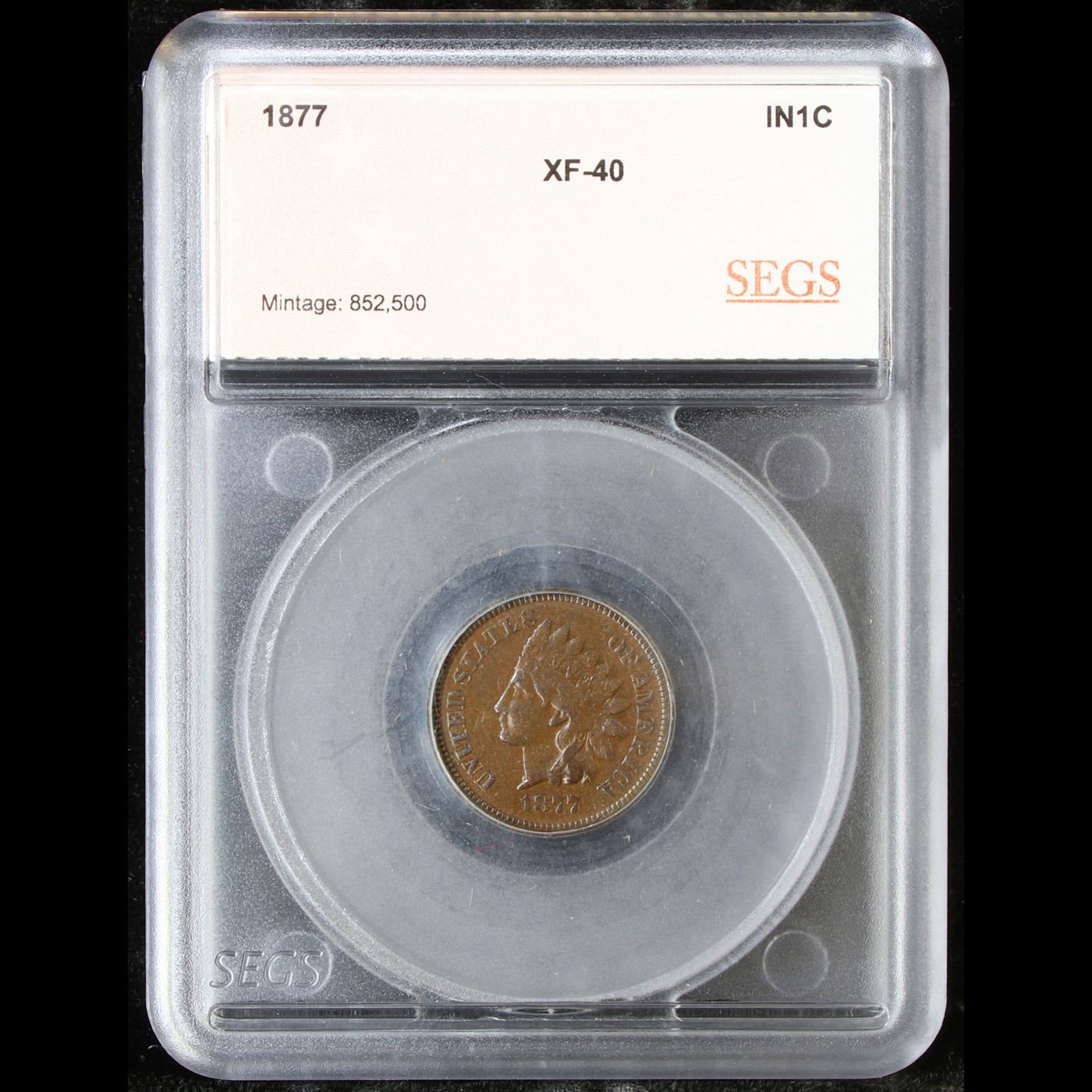 ***Auction Highlight*** 1877 Indian Cent 1c Graded xf40 By SEGS. The Key Date to the whole Indian Cent Series. According to Jaime Hernandez from PCGS, ‘The 1877 Indian Cent is unquestionably the most desirable coin in the entire circulation strike Indian Cent series. It is the second lowest mintage coin in the series, and only the 1909-S Indian cent has a lower mintage. Despite the 1877 Indian cent having the second lowest mintage in the series, it also survives in much smaller numbers than the 1909-S Indian cent. This is mainly due to the lack of coins being collected in 1877 compared to 1909. There is only one reverse die confirmed as striking all existing 1877 Indian cents. However, if there was only one reverse die employed to strike all (877,000)1877 Indian cents, then this lone die should have sustained major planchet flaws when striking such a large mintage. Surprisingly, this is not the case since 1877 cents show no traces of a damaged die. Therefore, it is strongly believed that the mintage of 877,000 coins struck, is actually a highly inflated figure.