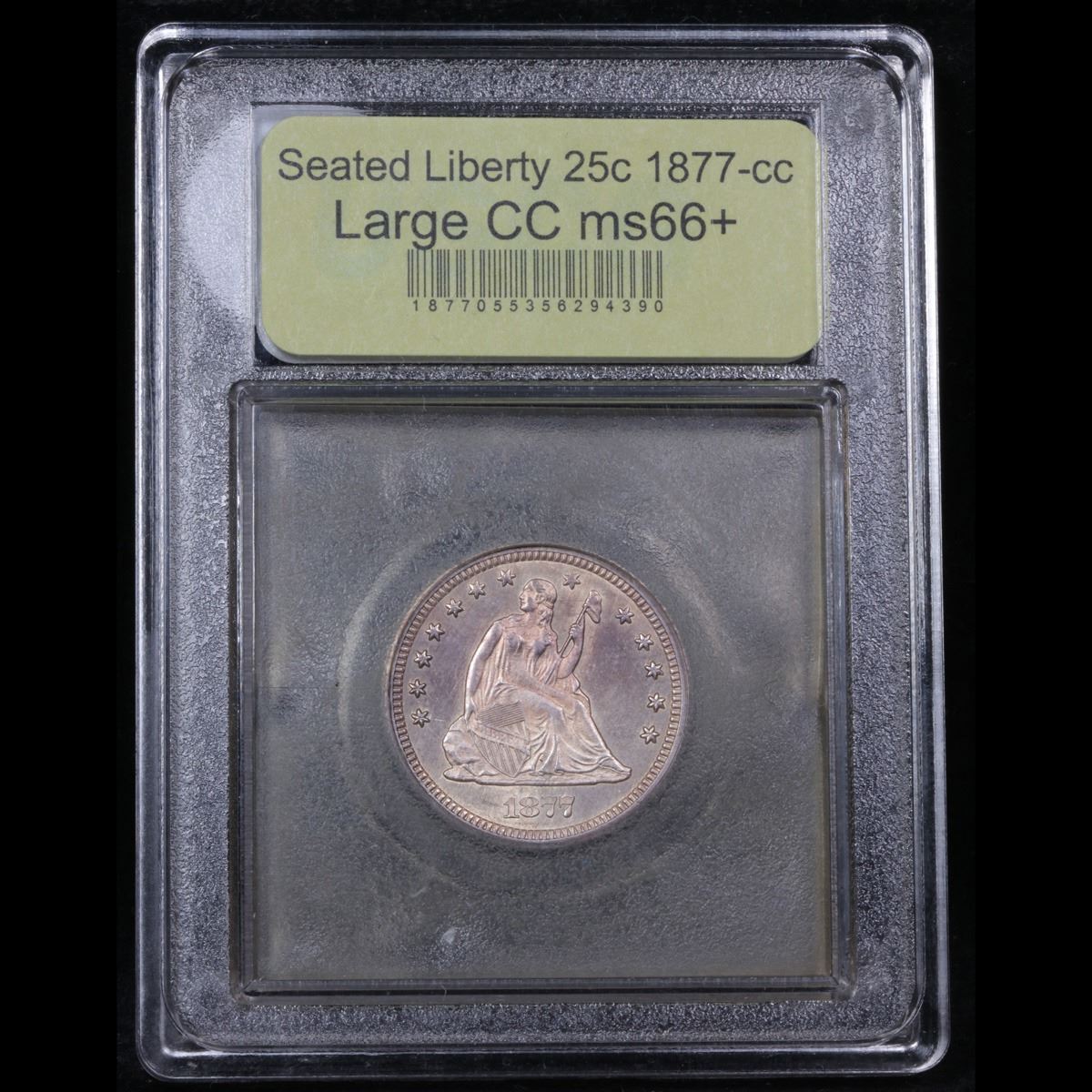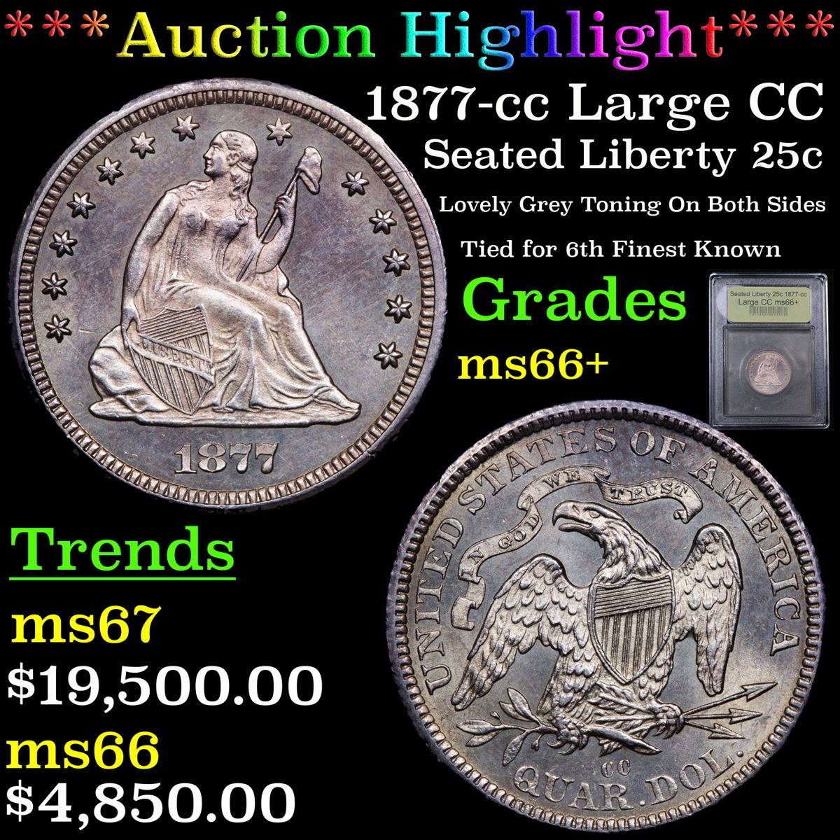 ***Auction Highlight*** 1877-cc Large CC Seated Liberty Quarter 25c Graded GEM++ Unc By USCG. Large CC. The two Cs in the mintmark are closely spaced and lean slightly to the left, unlike any reverse listed in the Briggs Encyclopedia. This Premium Gem has lovely gray toning on both sides. An impressive piece featuring a bold strike and superb luster, this is an excellent example for an advanced Seated quarter cabinet or a Carson City type set. Tied for 6th finest known. Trends ms66 $4,850 ms67 $19,500. A Corey's Pick, Bid to Win, Don't let it get Away, you might not find its equal Coin. I give this coin my highest recommendation