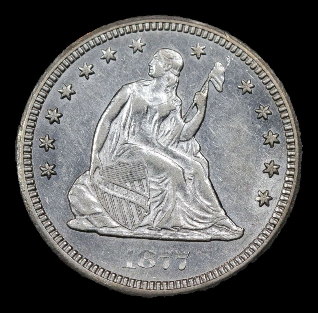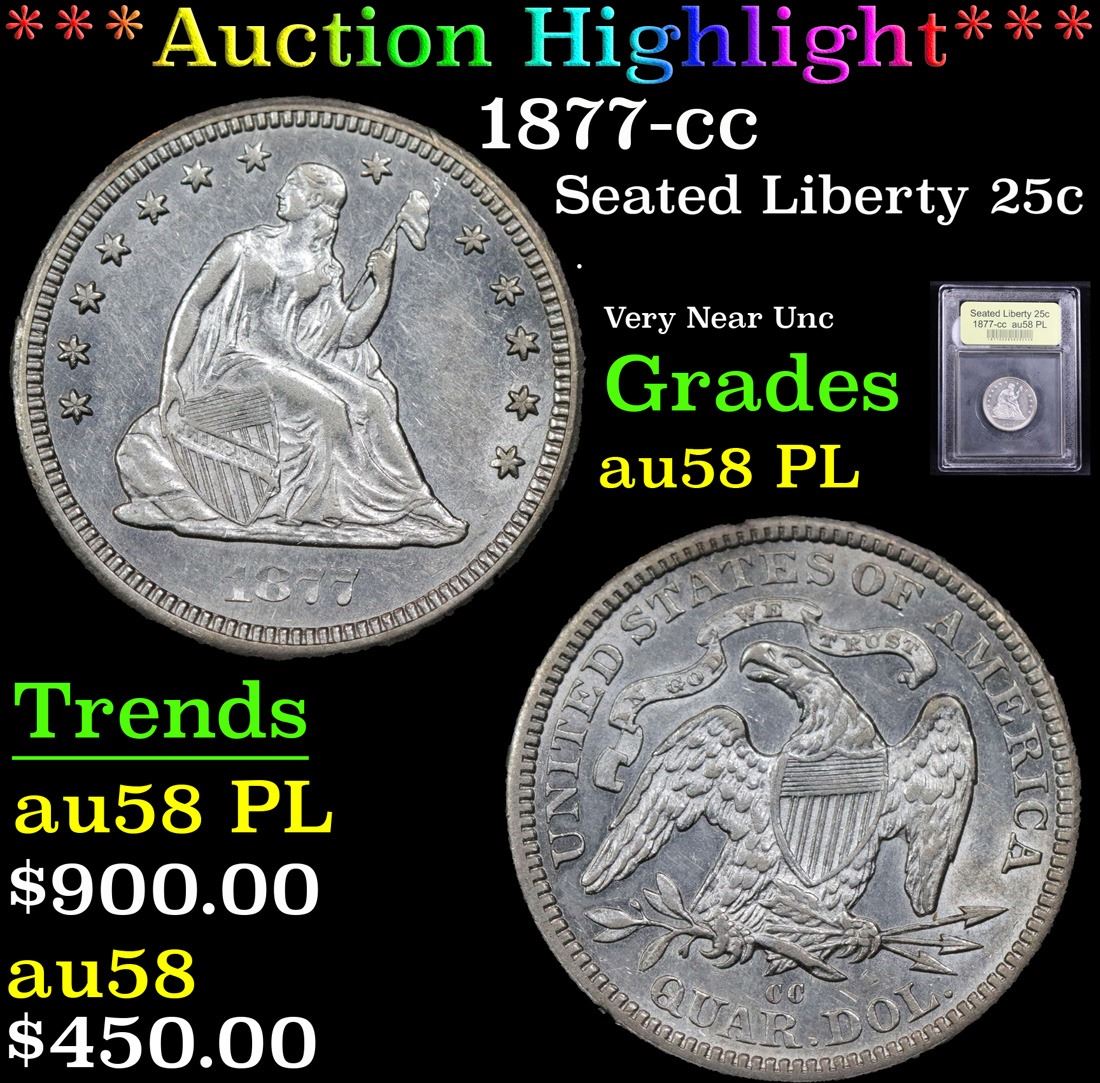 ***Auction Highlight*** 1877-cc . Very Near Unc Seated Liberty Quarter 25c Graded Choice AU/BU Slider PL By USCG.