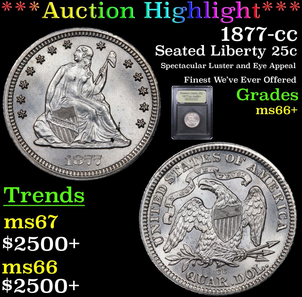 ***Auction Highlight*** 1877-cc Spectacular Luster and Eye Appeal Finest We've Ever Offered Seated Liberty Quarter 25c Graded GEM++ Unc By USCG. Spectacular Luster and Eye Appeal highlight this Pristine Example of the 1877 Carson City Seated Quarter. By far the finest we have ever offered. The coin is Superb. A Corey's Pick, Bid to Win, Don't let it get Away, you might not find its equal Coin