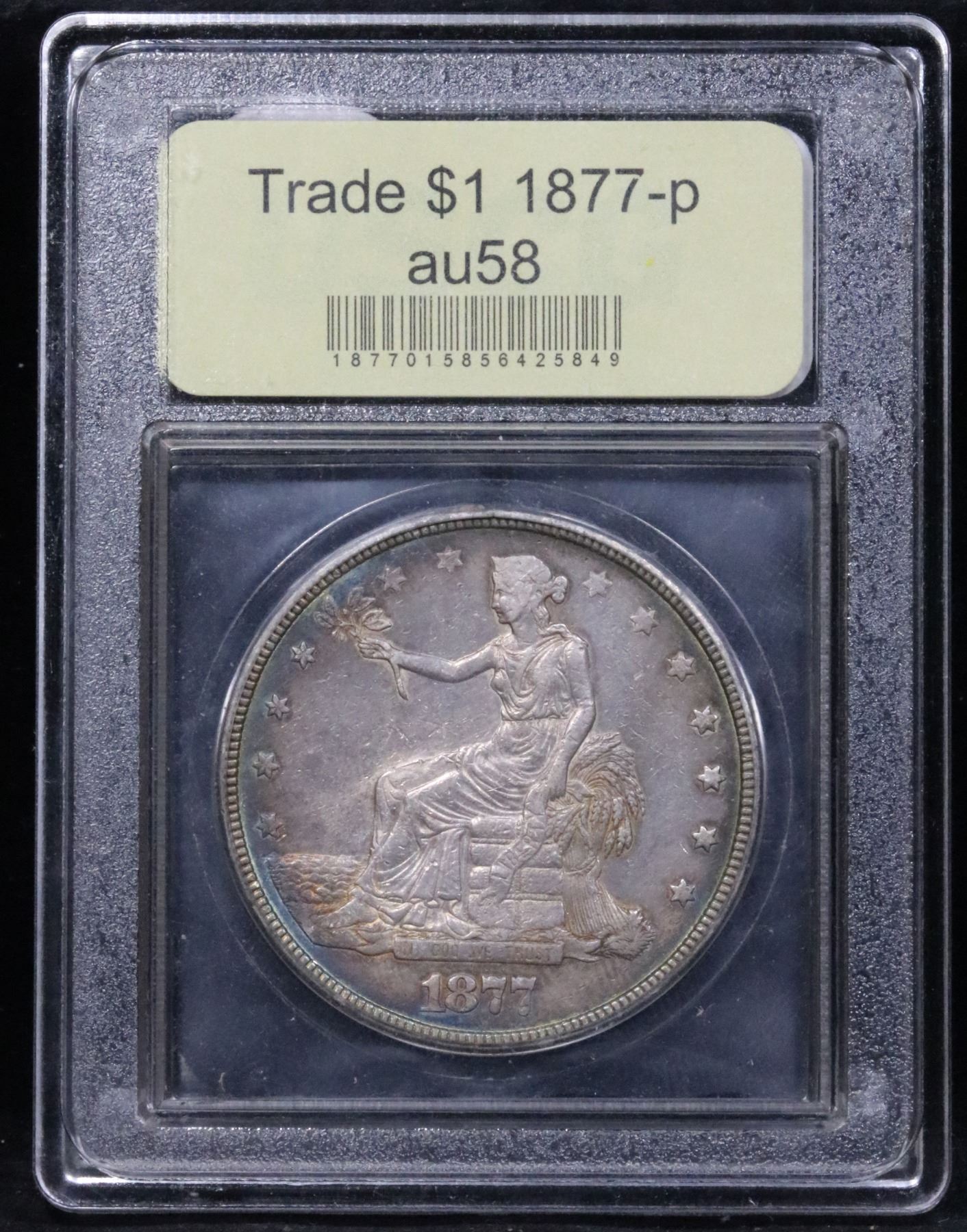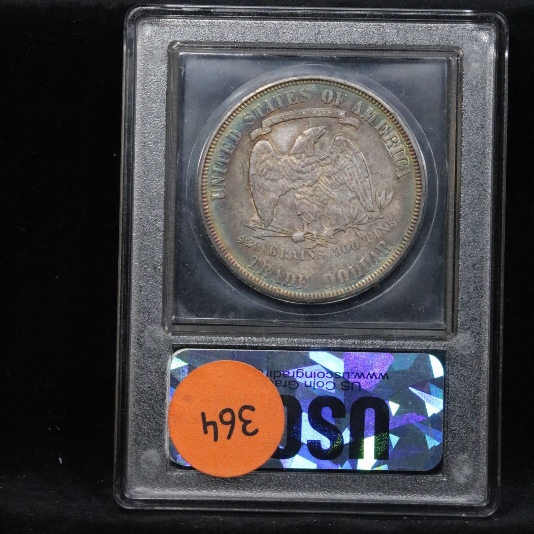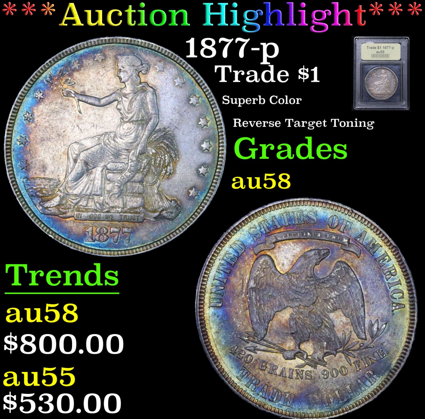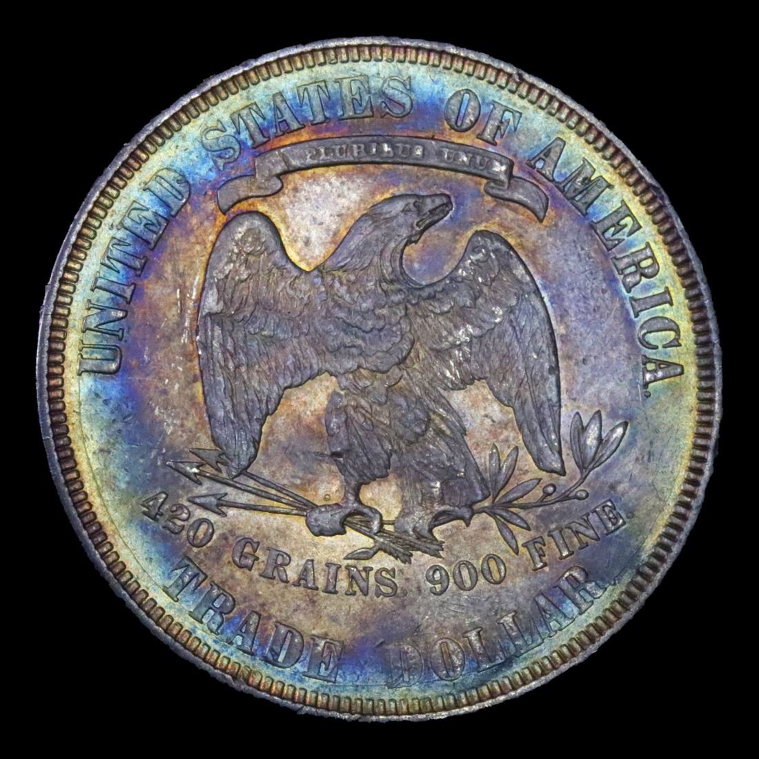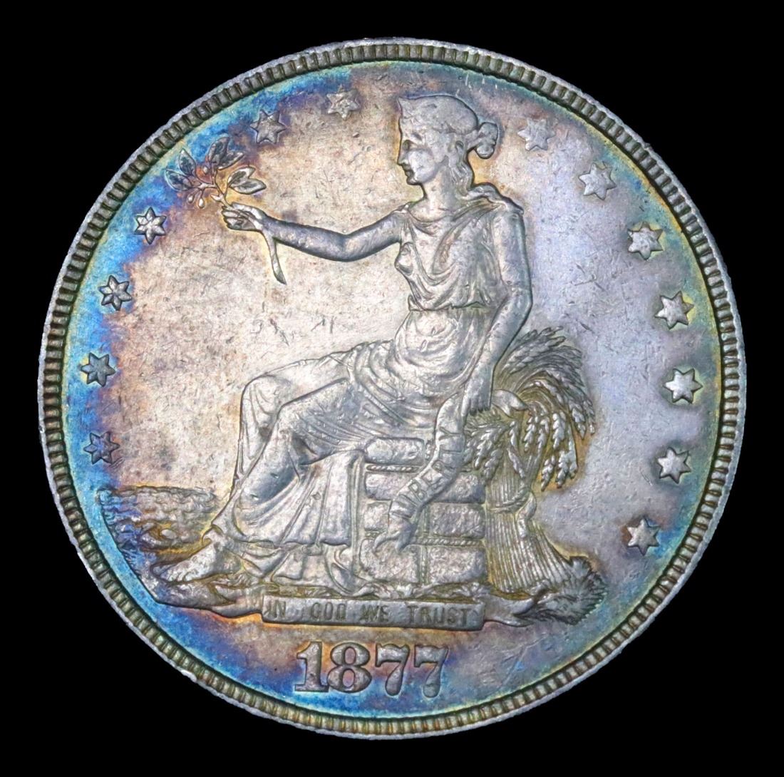 ***Auction Highlight*** 1877-p Trade Dollar $1 Graded Choice AU/BU Slider By USCG. Superb Color Reverse Target Toning A Corey's Pick, Bid to Win, Don't let it get Away Coin