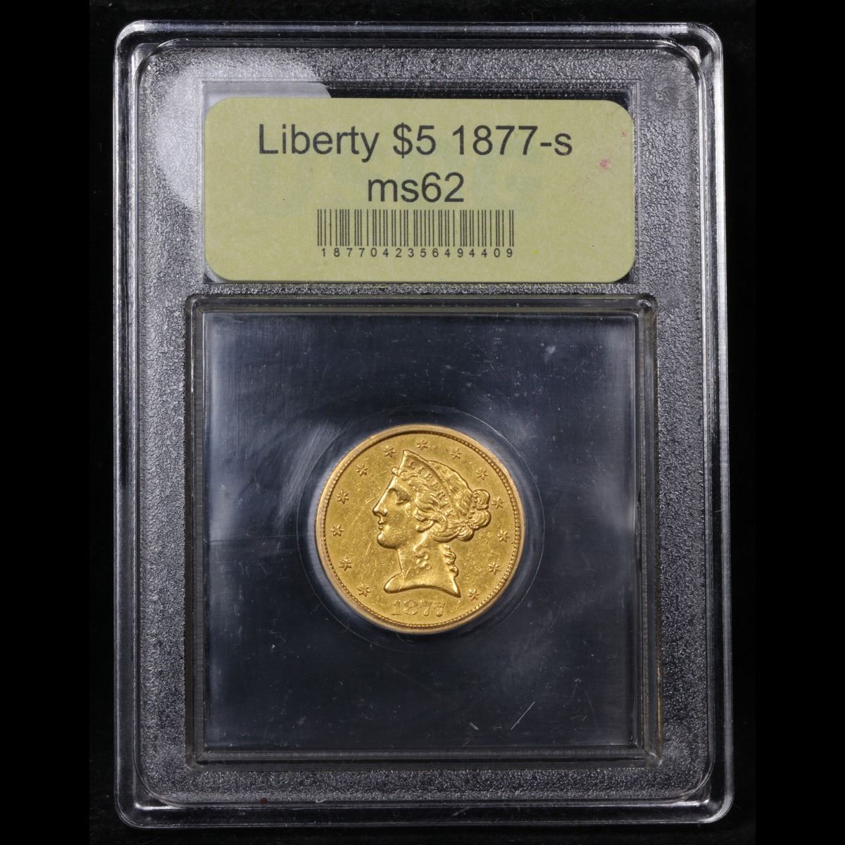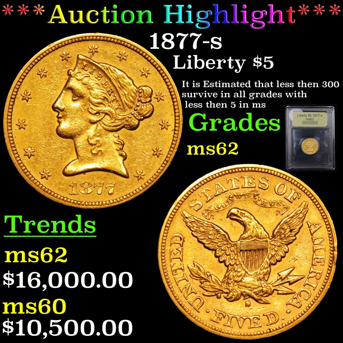 ***Auction Highlight*** 1877-s Gold Liberty Half Eagle $5 Graded Select Unc By USCG. Up for Auction is a Numismatic rarity, an Uncirculated 1877-s $5 Gold Liberty. It is estimated that less than 300 examples survive in all grades and less than 5 in Mint State. To date PCGS has only ever graded 3 examples as mint state and NGC has only ever graded 1 in Mint State condition. The example at hand is fully struck, has great eye appeal with pleasing orange gold surfaces. Moderate contact marks are normal for the grade. A true Numismatic rarity, and Tied for 2nd Finest known. (NGC’s sole Mint State example is ms61 and PCGS has 1 Graded ms60, 1 in ms61, 1 in ms62 and 1 in ms64. The PCGS ms61 and ms62 have never come to auction, the ms64 has come to auction twice, in 2002 and 2004, and not seen since. In 2002 it sold for $21,275, and in 2004 $28,750 and duplicates may be present in these 5 coins). Trends au58 $6,500 ms60 $10,500 ms61 $11,000, ms62 $16,000. I think a $16,000 estimate at the coin at hand is accurate (note the sole ms61 from ngc sold in 2007 at auction for $11,500, no coin over ms60 has sold at auction in over 13 years, until today)! A Corey's Pick, Bid to Win, Don't let it get Away, you might not find its equal Coin. I give this coin my highest recommendation