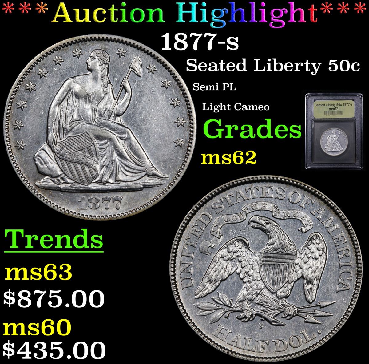 ***Auction Highlight*** 1877-s Seated Half Dollar 50c Graded Select Unc By USCG. A Corey's Pick, Bid to Win Coin