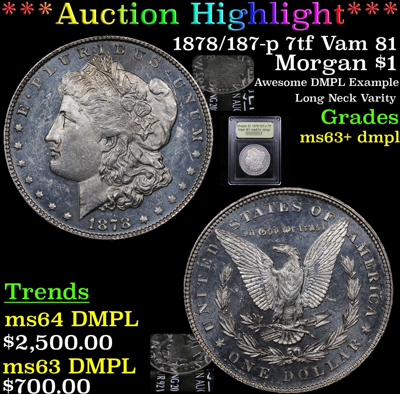 ***Auction Highlight*** 1878/187-p 7tf Vam 81 Awesome DMPL Example Long Neck Varity Morgan Dollar $1 Graded Select Unc+ DMPL By USCG. Awesome Deep Mirror Proof Like example of a terrific Variety. It is the Long Nock variety of the 1878-p 7tf. Specifically the vam 81. Tons going on in the terrific coin. Obverse II/I 7 - Type II Liberty with thick letters. Doubled E, P and R in PLURIBUS. Doubled 187 in date with 1 doubled on left of shaft, 8 on top surface and 7 on left of top serif. All left stars and first three right doubled. Area around nose and lips over-polished. Fine diagonal polishing line through R in LIBERTY. The Top inside of Liberty's ear has been polished down to the point that little of the inside design remains. The first two stars to the right of the date are notched. There is a clash mark at the top of the left wreath on the Reverse. The top 3 leaves of the olive branch are disconnected. It has also been noticed that on all VAM-81s, the reverse has the clashed lip from the obverse next to the left wreath A Corey's Pick, Bid to Win, Don't let it get Away Coin