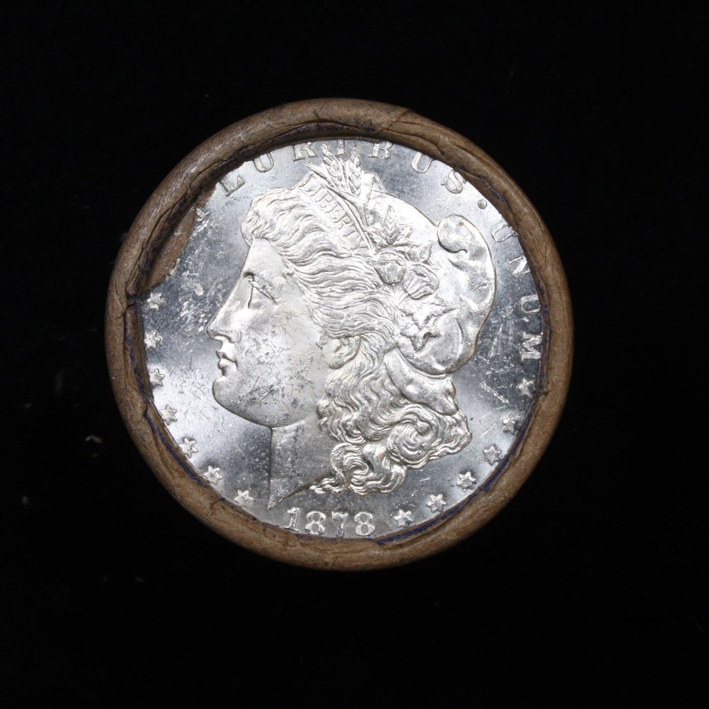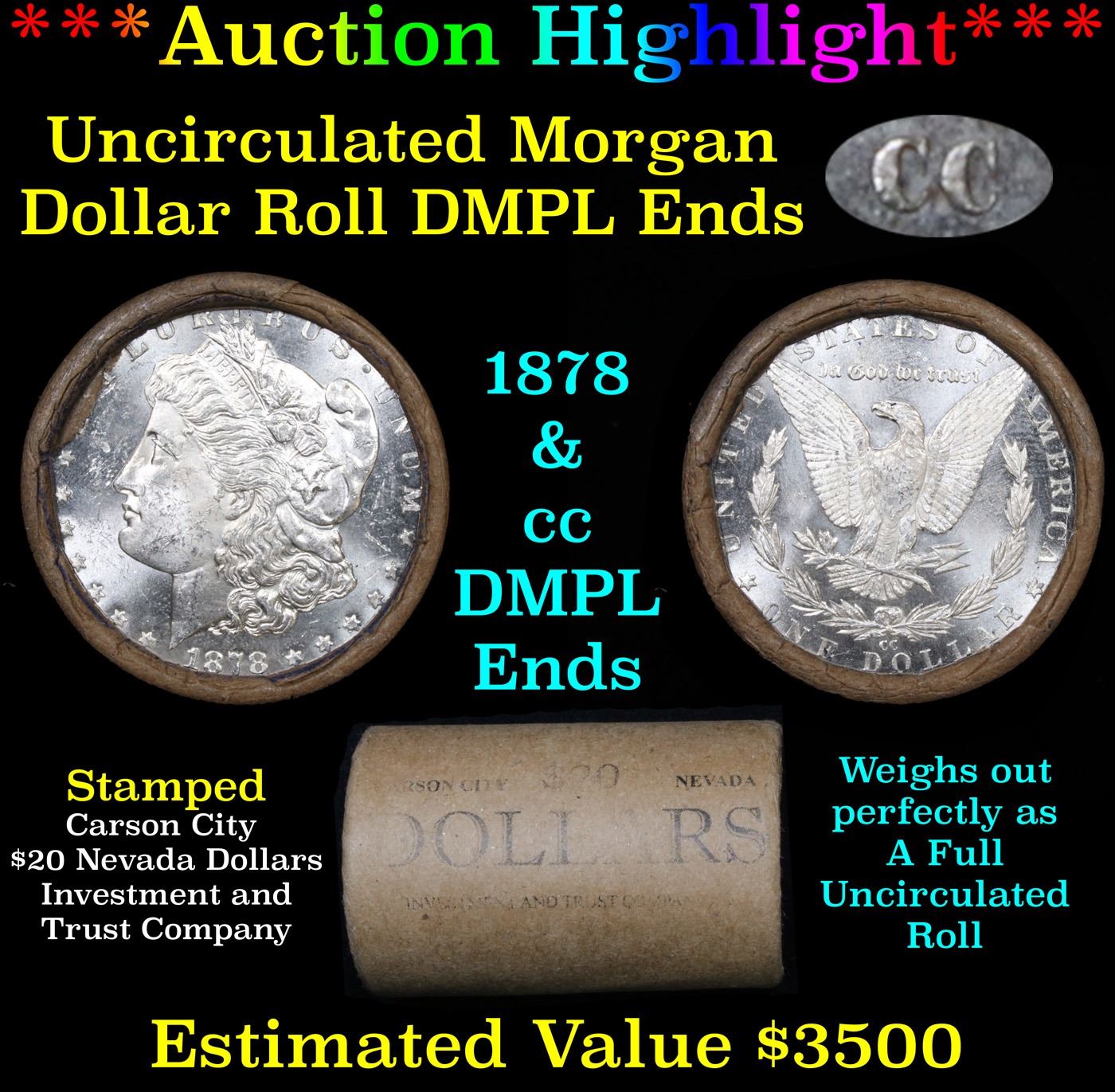 ***Auction Highlight*** 1878 & CC DMPL Ends Uncirculated Morgan Dollar Shotgun Roll. 1878 & CC DMPL Ends Uncirculated Morgan Dollar Shotgun Roll. Uncirculated Morgan Dollar Roll, Superb Ends, Carson City, Nevada Investment and Trust Co wrapper. Weighs Perfectly as a Uncirculated Roll. Great luster and some light golden toning on the ends Estimated Value $3500