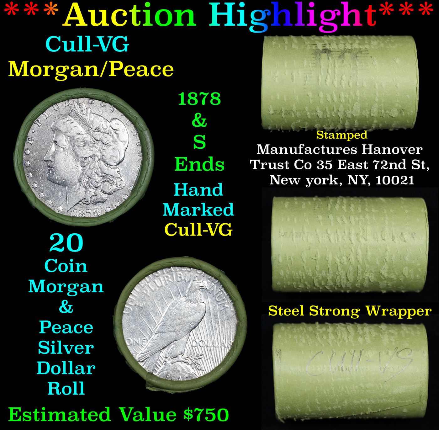 ***Auction Highlight*** 1878 Morgan & S Peace Ends Cull-VG Mixed Morgan/Peace Silver Dollar Shotgun Roll, 20 Coins. Cull-VG Mix Silver Dollar Roll, 20 Coins in old Manufactures Hanover Trust Co 35 East 72nd St, New york, NY, 10021 Wrapper with Tight Shotgun Ends.