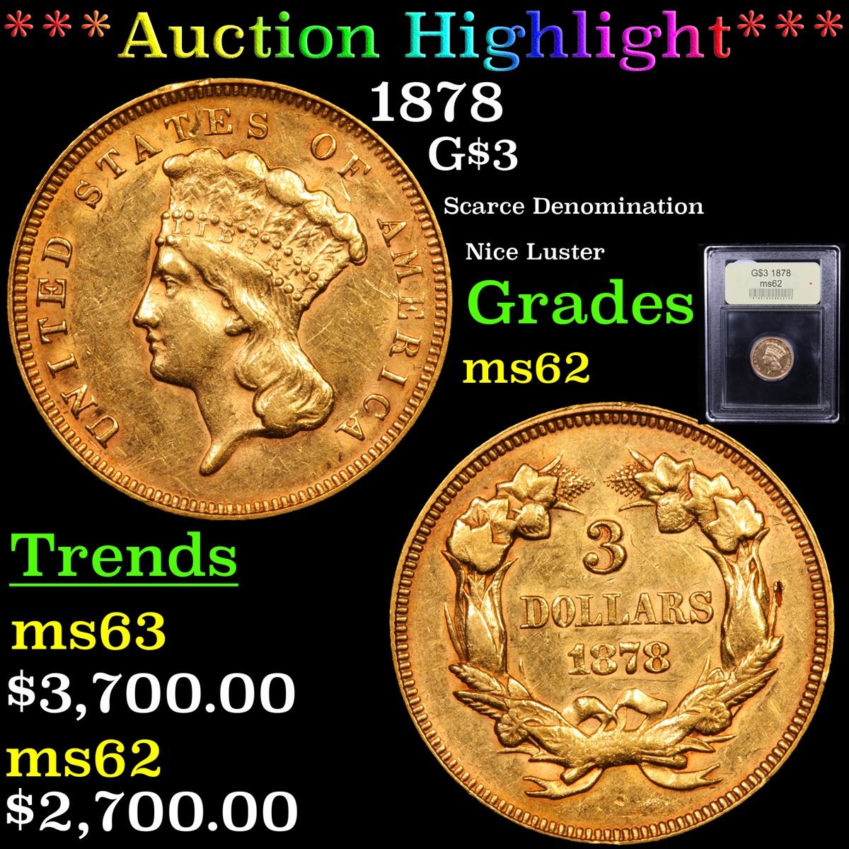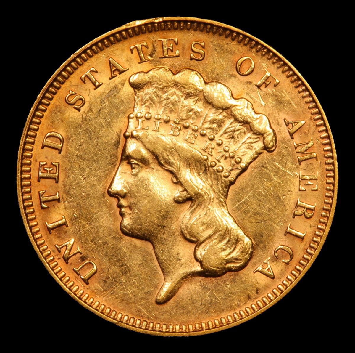 ***Auction Highlight*** 1878 Three Dollar Gold 3 Graded Select Unc BY uSCG. This predominantly honey-rose example offers good luster quality for the assigned grade and overall bold striking detail. Ideal for inclusion in an Uncirculated type set that requires an example of this brief and challenging 19th century gold denomination.