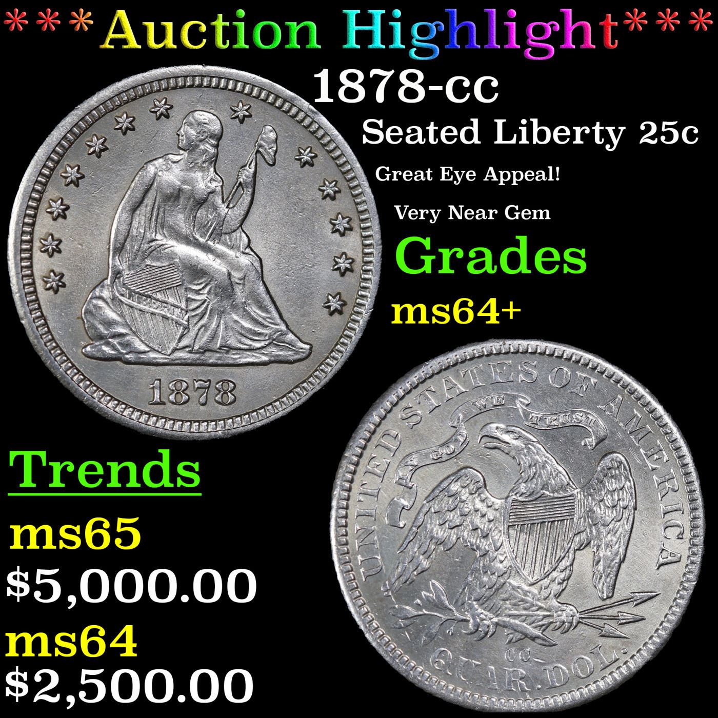 ***Auction Highlight*** 1878-cc Seated Liberty Quarter 25c Graded ms64+ BY SEGS. A Key Date's Pick, Bid to Win, Don't let it get Away Coin