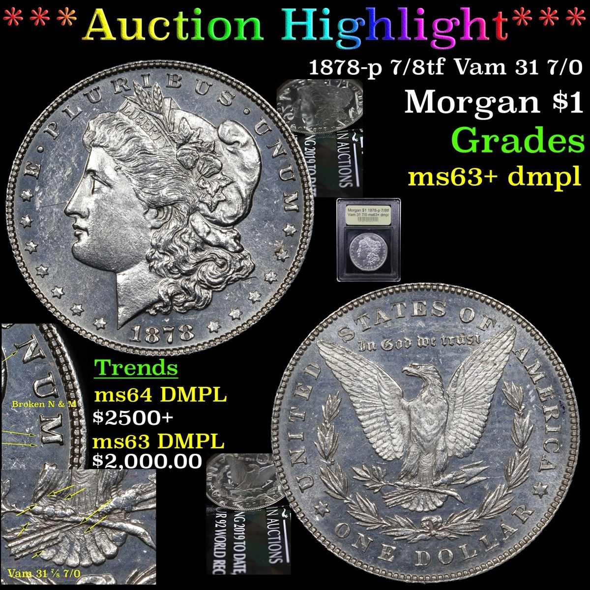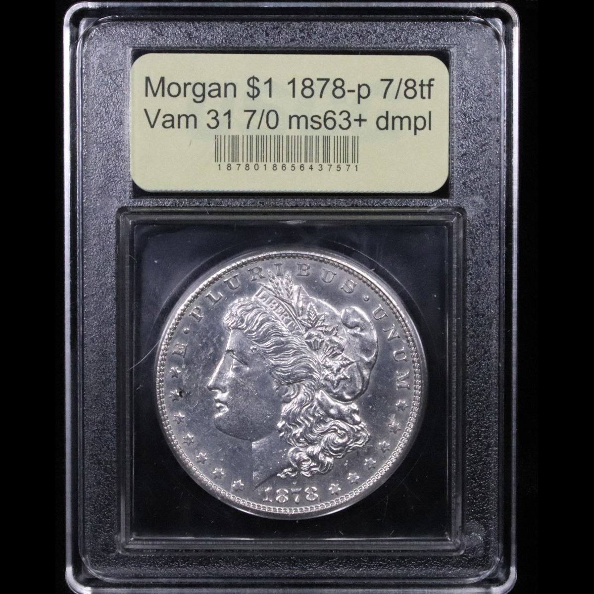 ***Auction Highlight*** 1878-p 7/8tf Vam 31 7/0 . . Morgan Dollar $1 Graded Select Unc+ DMPL By USCG. One of the coolest 7/8 varities this is the vam 31 with the broken 'n' and 'm' and the 7/0 tail feathers. The extrodinary die file lines removing the extra tail feathers are incedible to see. Finding this teriffic vam 31 in DMPL is a true find. The vam 31 is recoginized by PCGS asa 7/8 varity. it has an intrest level of 5 our of 5 and a rarity level of 5 A Corey's Pick, Bid to Win, Don't let it get Away Coin