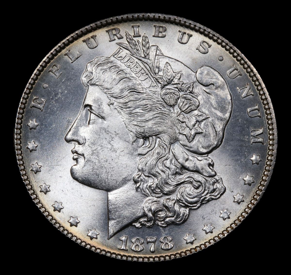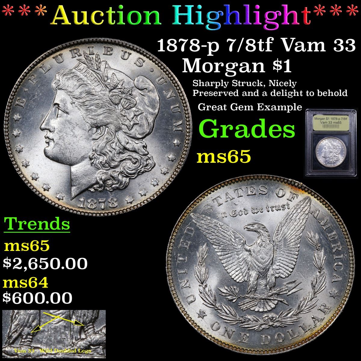 ***Auction Highlight*** 1878-p 7/8tf Vam 33 Morgan Dollar $1 Graded GEM Unc By USCG. Up for auction is a superb 1878-p 7/8tf Morgan dollar. A delightful Gem with endearing satin white brilliance that is accented by a few wisps of pale gold iridescence here and there around the peripheries. Sharply struck, nicely preserved and a delight to behold. It is also the terrific Vam 33 with the Wild Doubled legs.