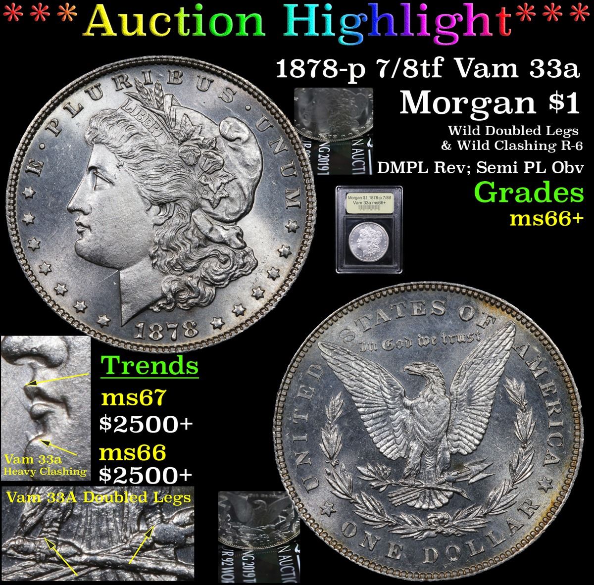 ***Auction Highlight*** 1878-p 7/8tf Vam 33a Wild Doubled Legs & Wild Clashing R-6 DMPL Rev; Semi PL Obv Morgan Dollar $1 Graded GEM++ Unc By USCG. Incredible Coin: Up for auction is one of the finest 1878-p ?tf we have ever offered. It is near pristine, with a near perfect frosted cheek. Outstanding eye appeal and a great Variety. It is the VAM 33A with Heavy clashing and the Wild doubled legs, it is a Rarity 6 Variety. Additionally, the coin has a superb DMPL reverse with just a hint of Golden Rim toning and a semi PL Obverse. INCREDIBLE FIND, a great addition to any collection. A Corey's Pick, Bid to Win, Don't let it get Away, you might not find its equal Coin. I give this coin my highest recommendation