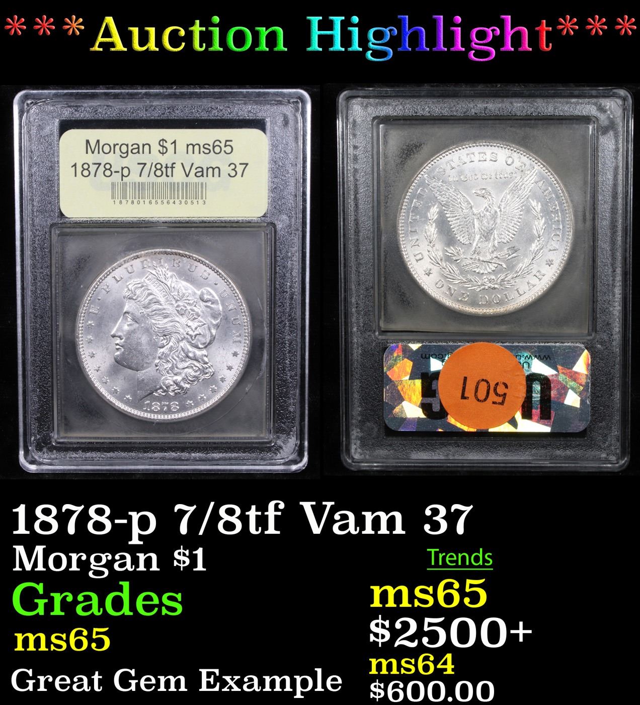 ***Auction Highlight*** 1878-p 7/8tf Vam 37 Morgan Dollar $1 Graded GEM Unc By USCG.