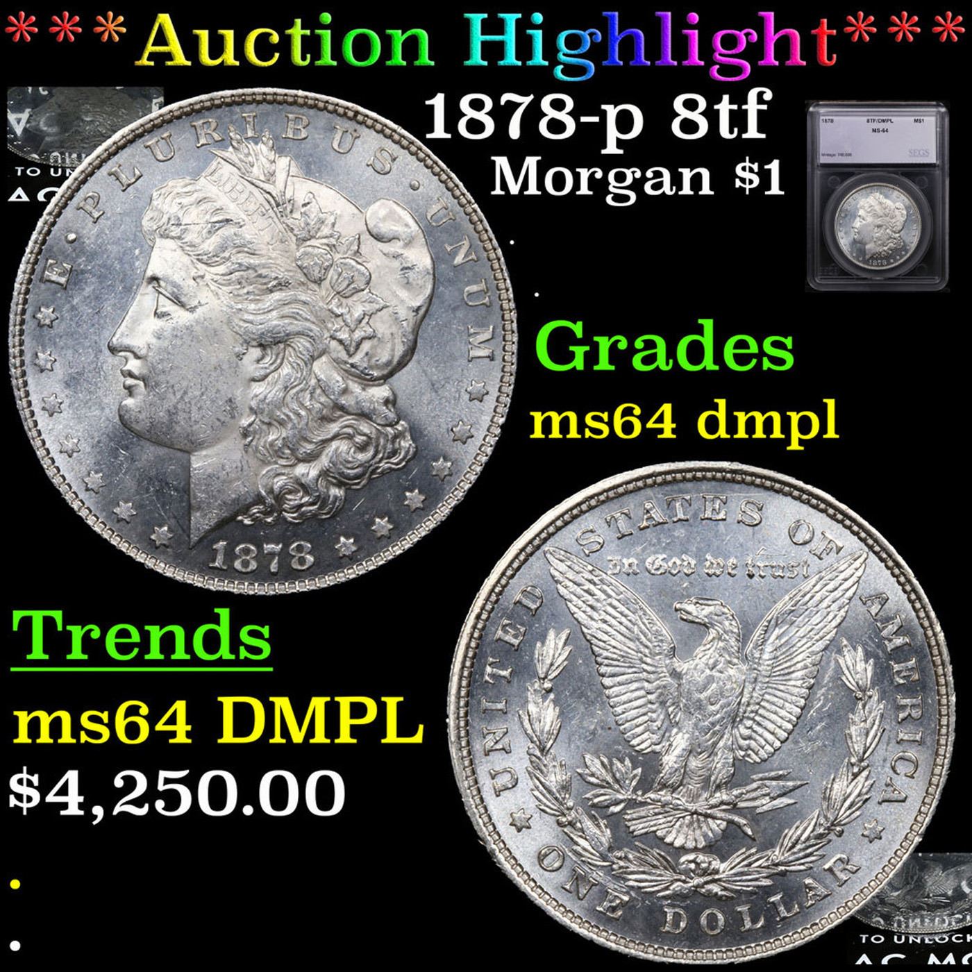 ***Auction Highlight*** 1878-p 8tf Morgan Dollar $1 Graded ms64 dmpl By SEGS. A Corey's Pick, Bid to Win, Don't let it get Away, you might not find its equal Coin