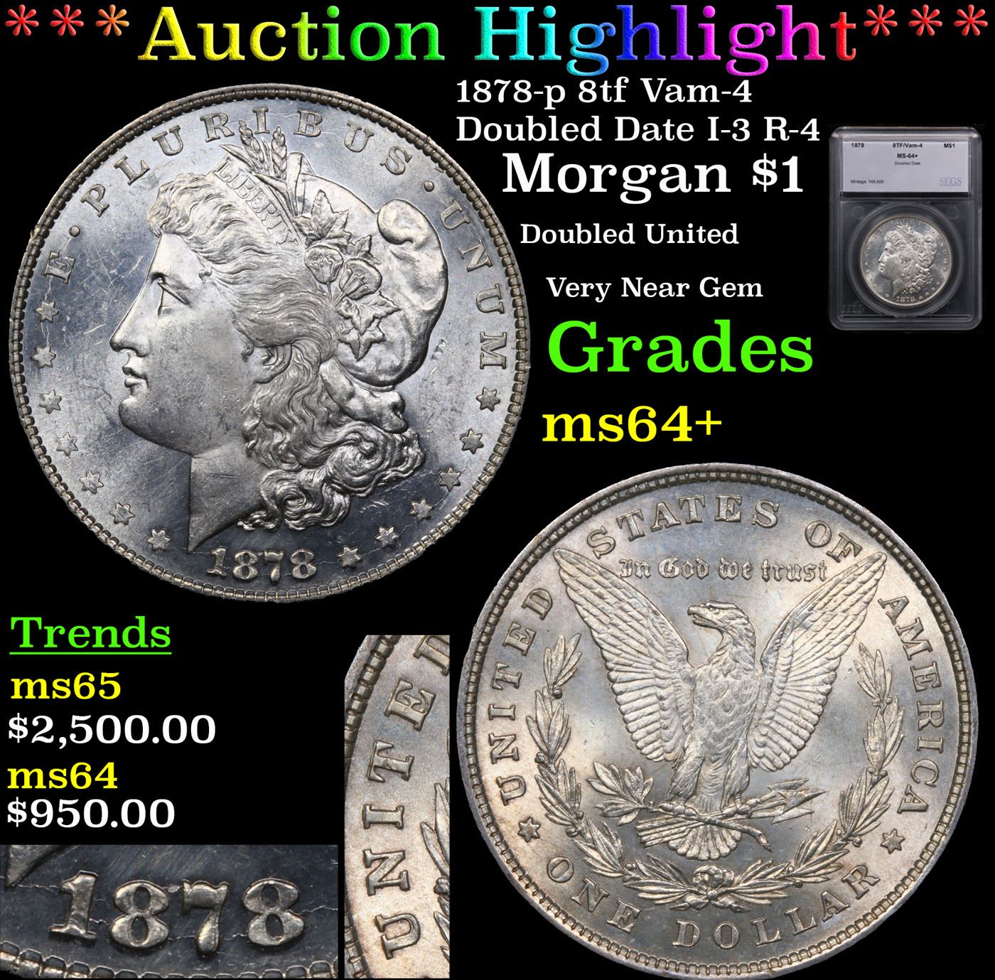 ***Auction Highlight*** 1878-p 8tf Morgan Dollar Vam-4 Doubled Date I-3 R-4 $1 Graded ms64+ By SEGS