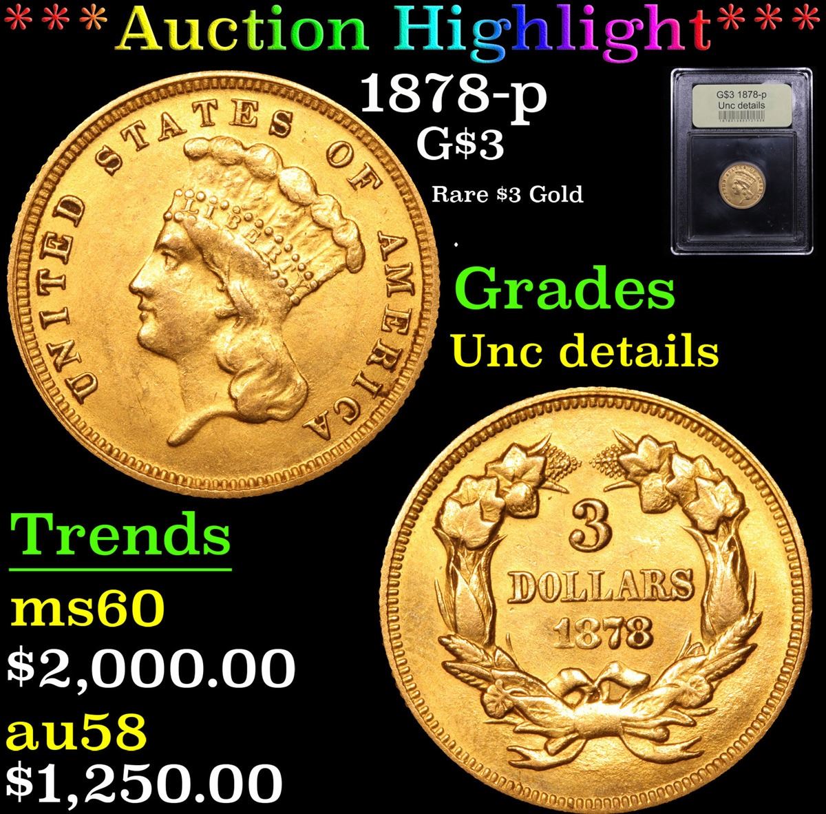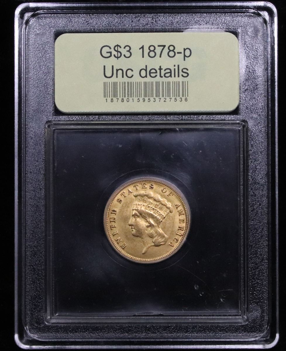 ***Auction Highlight*** 1878-p Rare $3 Gold . G$3 3 Graded Unc Details By USCG. 0