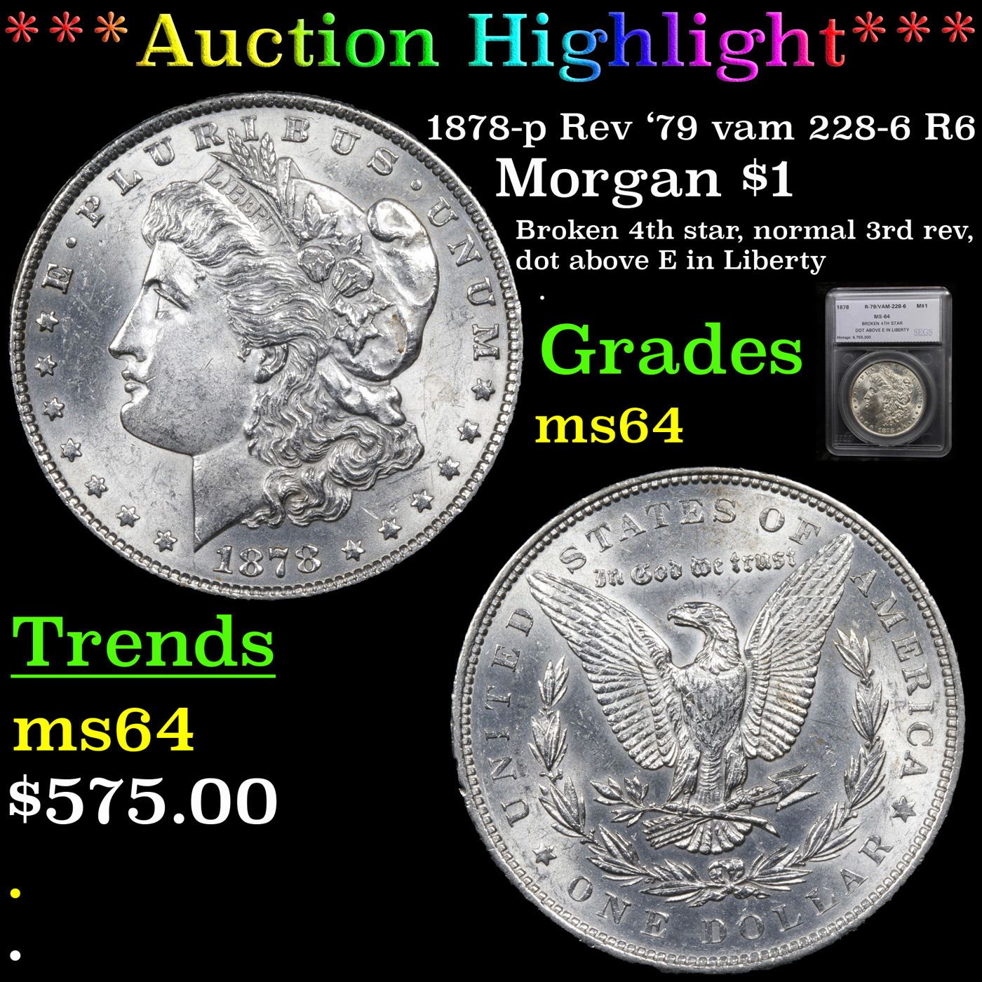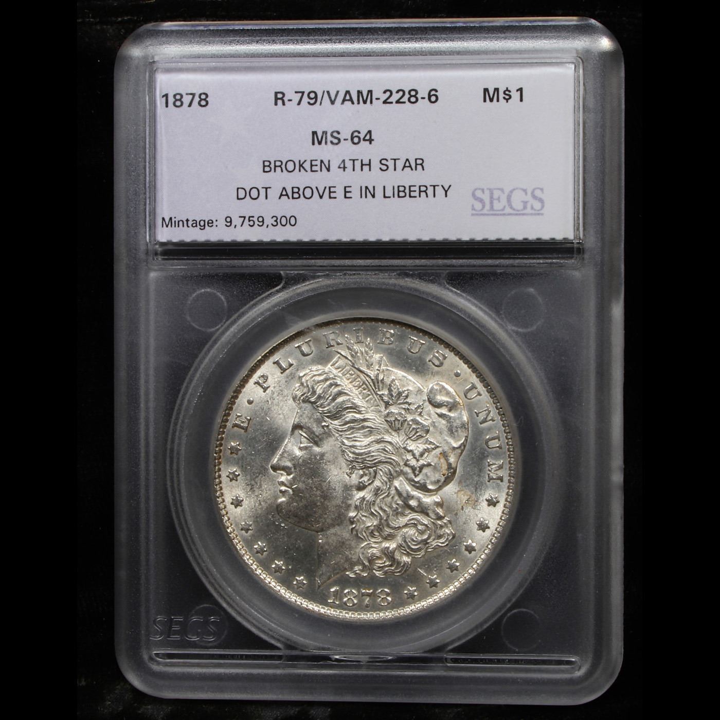***Auction Highlight*** 1878-p Rev '79 vam 228-6 R6 Morgan Dollar $1 Graded ms64 By SEGS (fc)