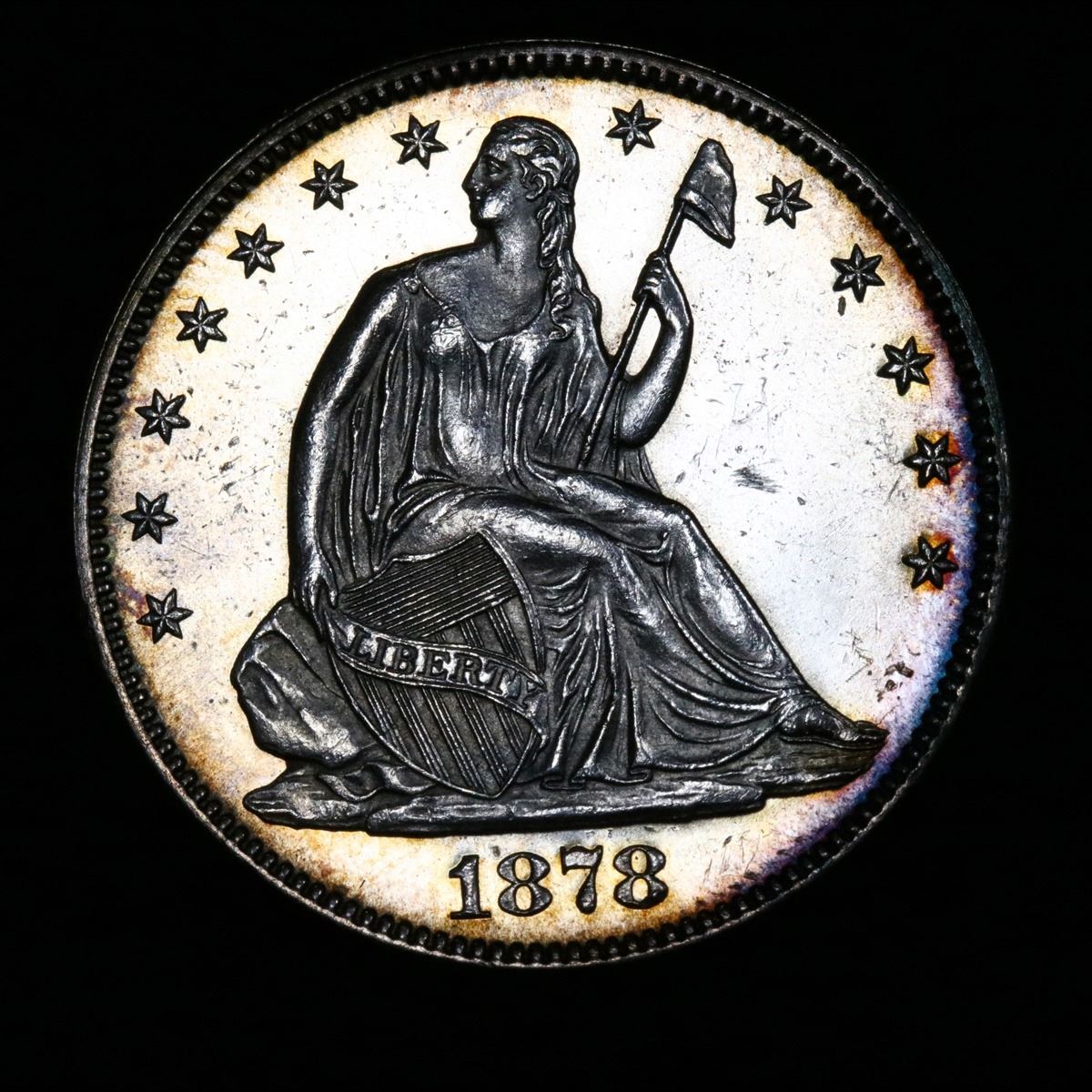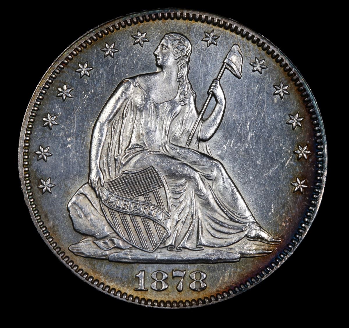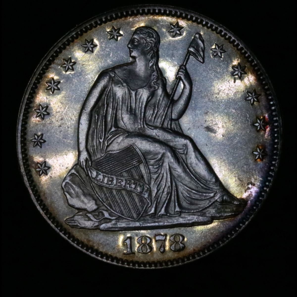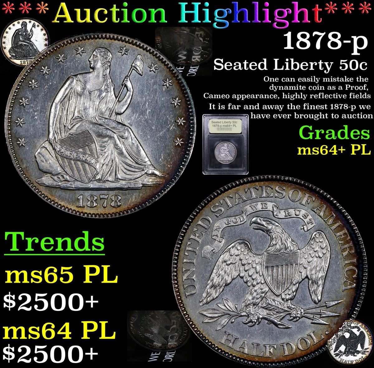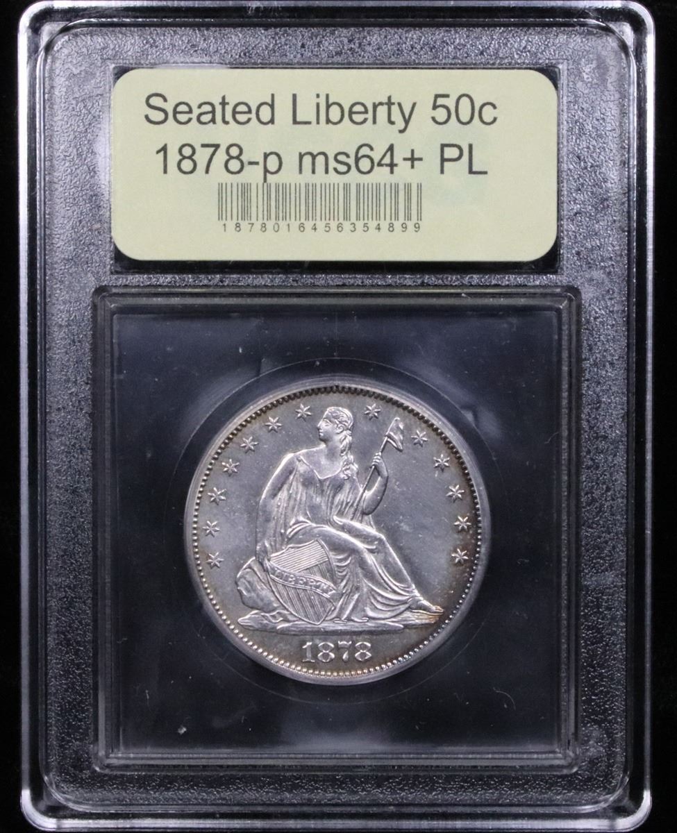 ***Auction Highlight*** 1878-p One can easily mistake the dynamite coin as a Proof, Cameo appearance, highly reflective fields It is far and away the finest 1878-p we have ever brought to auction Seated Half Dollar 50c Graded Choice Unc+ PL By USCG. Up for auction is an incredibly beautiful and rare 1878-p Proof Like PL Seated Half. It has beautiful colorful rim toning and sharp devices. One can easily mistake the dynamite coin as a Proof, Cameo appearance, highly reflective fields. It is far and away the finest 1878-p we have ever brought to auction. To date PCGS has grade zero PL and NGC has graded 2, one ms61pl and one ms65pl. The ms65pl when it went to auction in 2014, it realized $4139.53. I can honestly say, ours is nicer, and much more reflective, bordering on DMPL A Corey's Pick, Bid to Win, Don't let it get Away, you might not find its equal Coin. I give this coin my highest recommendation