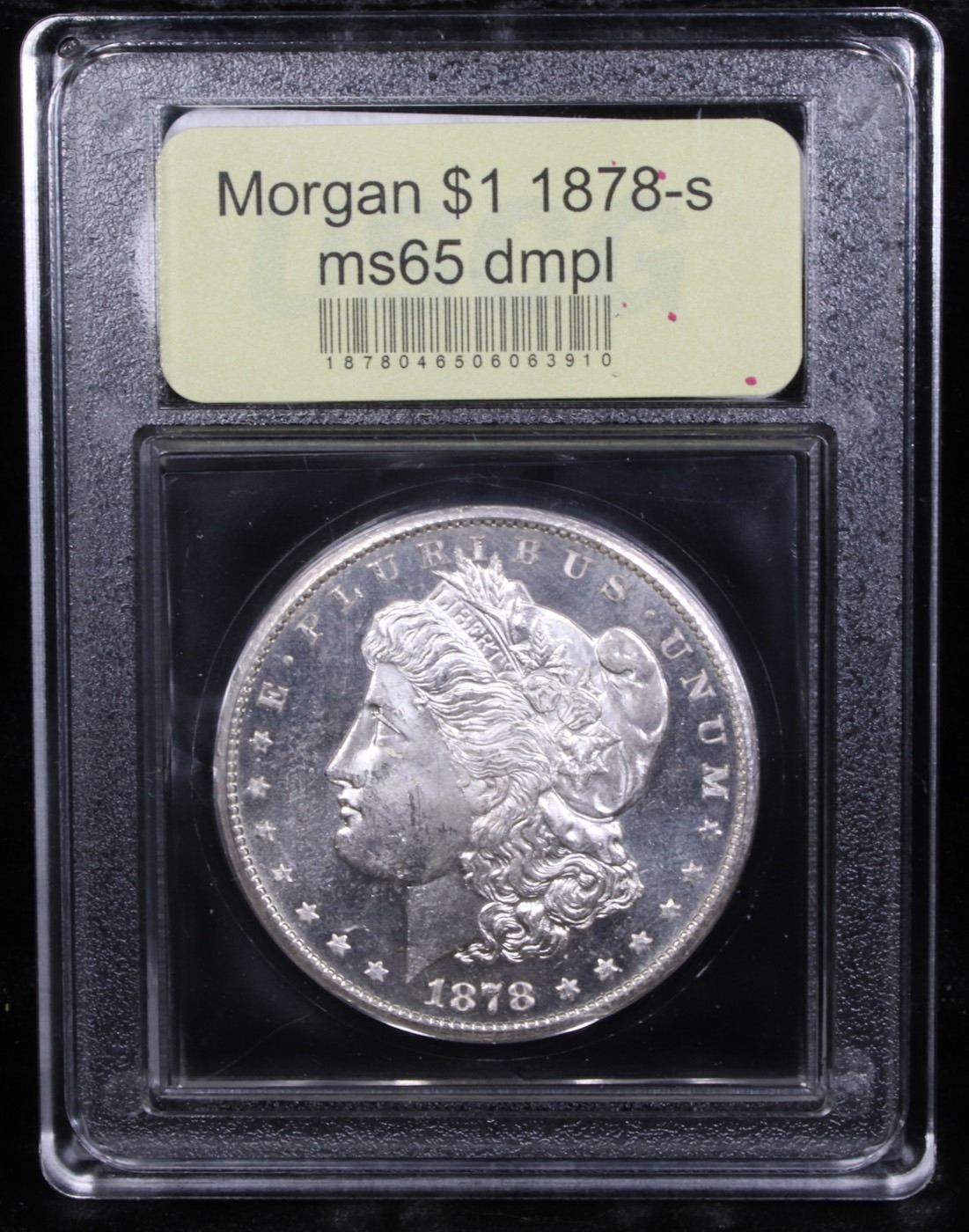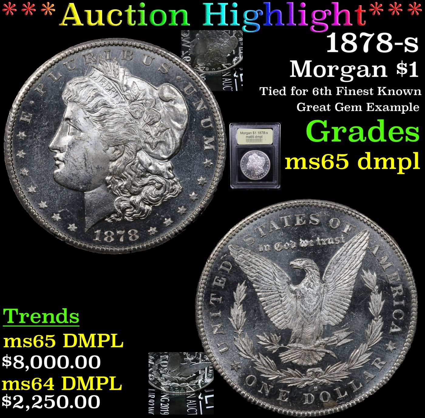 ***Auction Highlight*** 1878-s Morgan Dollar $1 Graded GEM Unc DMPL BY USCG. Slightly better date. First year of issue. Frosty devices and glassy fields confirm the DMPL designation of this first-year Morgan dollar. The contrast is especially notable. The coin overall is brilliant and boldly struck with a refreshingly unabraded appearance A Corey's Pick, Bid to Win, Don't let it get Away, you might not find its equal Coin. I give this coin my highest recommendation