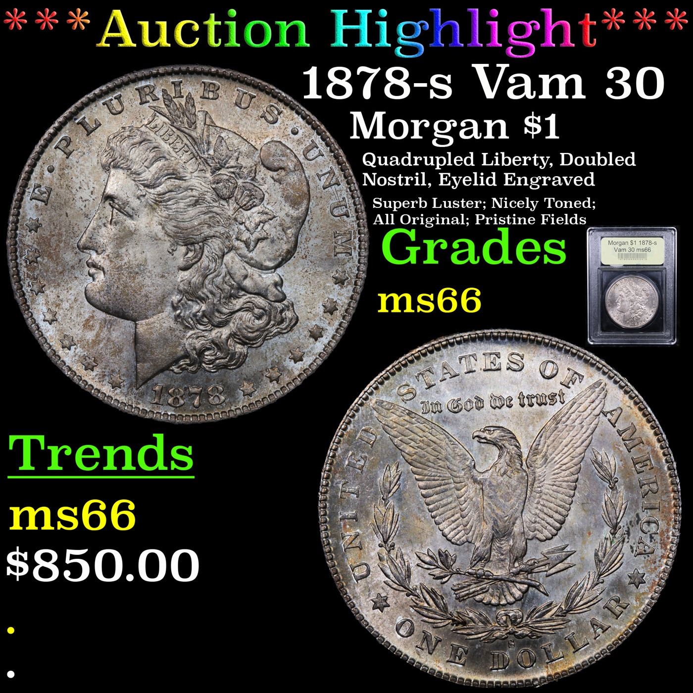 ***Auction Highlight*** 1878-s Vam 30 Morgan Dollar $1 Graded GEM+ Unc BY USCG. A Corey's Pick, Bid to Win Coin
