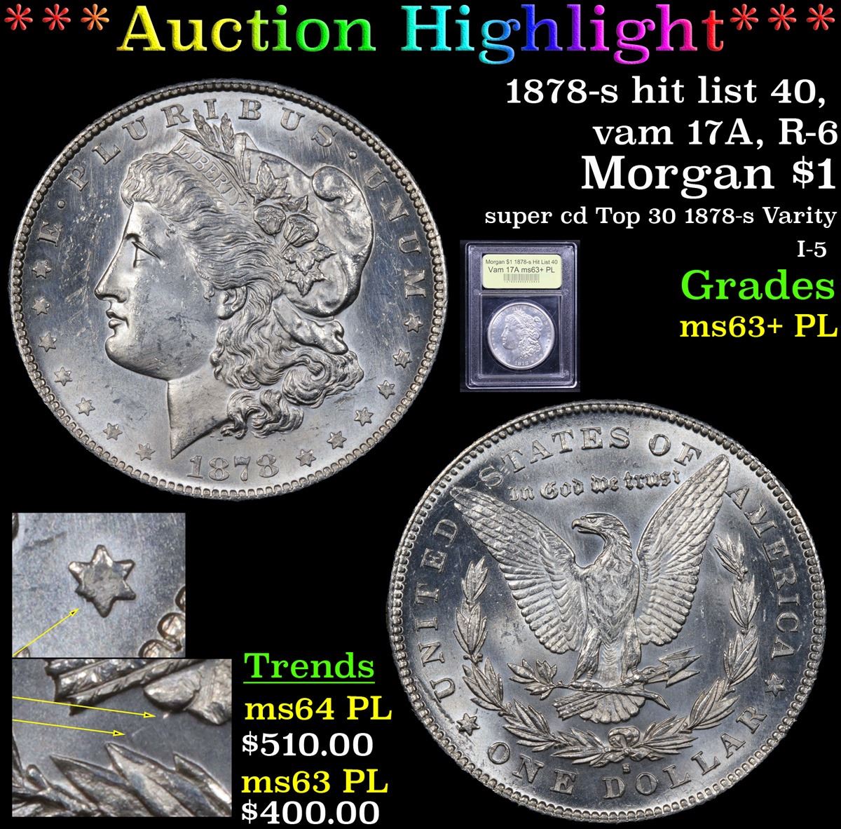 ***Auction Highlight*** 1878-s hit list 40, vam 17A, R-6 Morgan Dollar $1 Graded Select Unc+ PL By USCG. 1878-S VAM-17A: I-5 R-6 - This coin is a Hit List 40 and a Super CD, This is a Top 30 1878-S Die Variety. The pick up points are, the Point of fourth right star completely missing. Slightly raised denticle impressions thru OLL in DOLLAR, below OL and four slanted impressions below left tail feathers. The Vam 17A has the most clashed denticles discovered on any Morgan.This is member of the "Super CD" list of the most desirable clashed dies and a Hit List 40 VAM. A Corey's Pick, Bid to Win, Don't let it get Away Coin