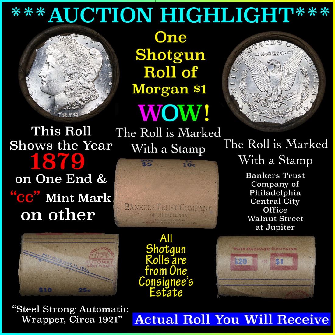 ***Auction Highlight*** 1879 & CC Uncirculated Morgan Dollar Shotgun Roll . .. Uncirculated Morgan Dollar Roll, Superb Ends, Old Steel Strong Wrapper, Faintly Stamped Bankers Trust Company Of Philadelphia, Walnut St at Juniper. Weighs Perfectly as a Uncirculated Roll. The 1879 is Proof Like and the other end is a CC Reverse