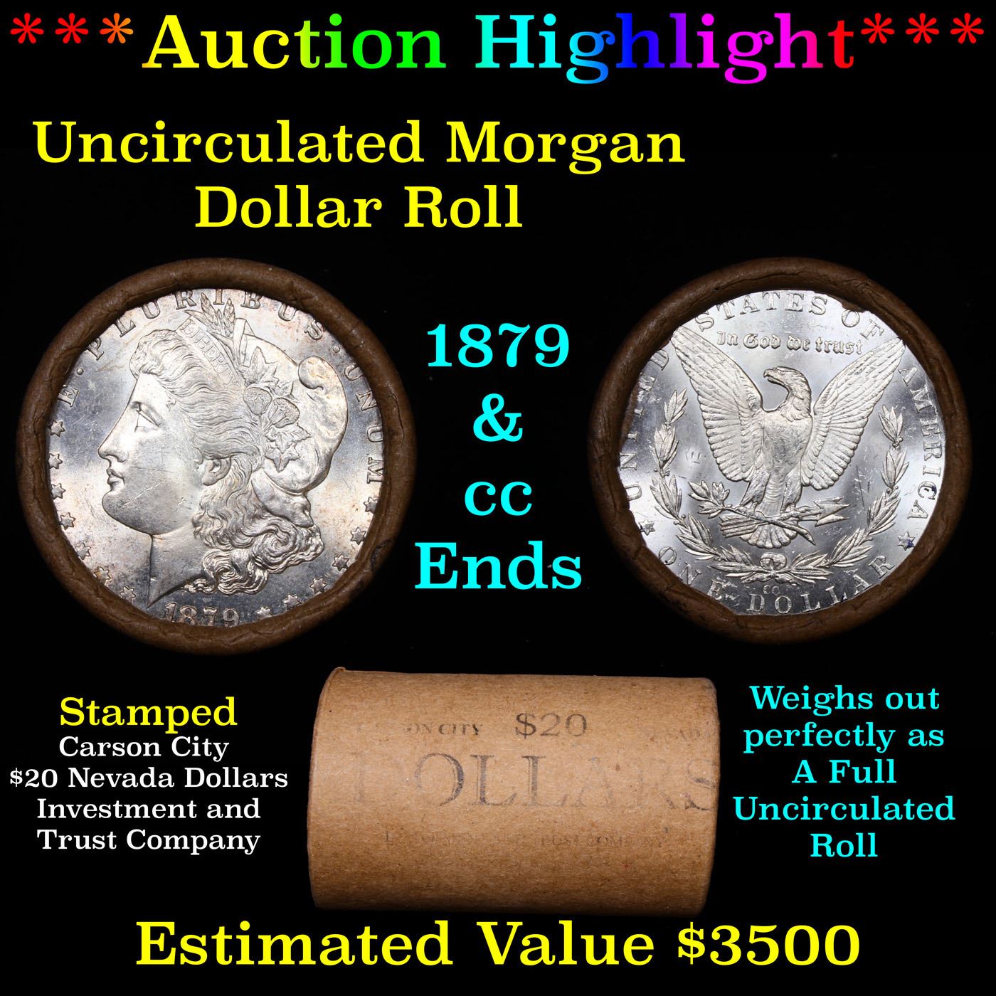 ***Auction Highlight*** 1879 & CC Uncirculated Morgan Dollar Shotgun Roll. Uncirculated Morgan Dollar Roll, Superb Ends, Carson City, Nevada Investment and Trust Co wrapper. Weighs Perfectly as a Uncirculated Roll.