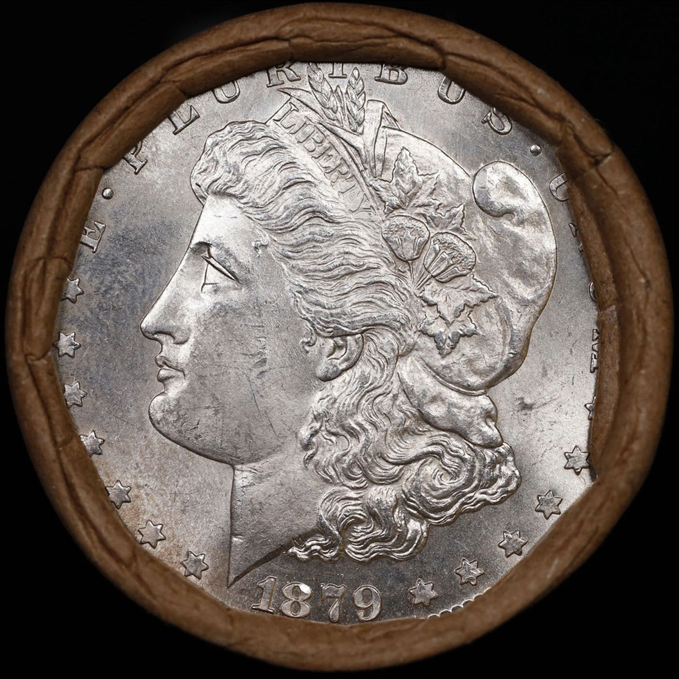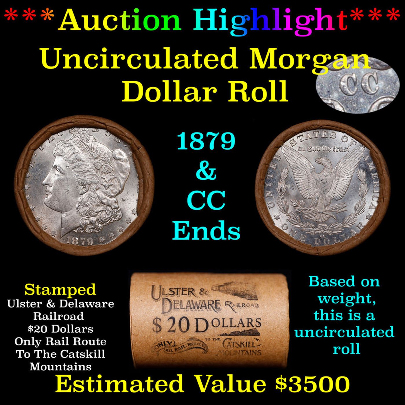 ***Auction Highlight*** 1879 & CC Uncirculated Morgan Dollar Shotgun Roll. Uncirculated Morgan Dollar Roll, Superb Ends In an old Ulster & Deleware Railroad to the Catskill Mountains wrapper. Weighs Perfectly as a Uncirculated Roll.