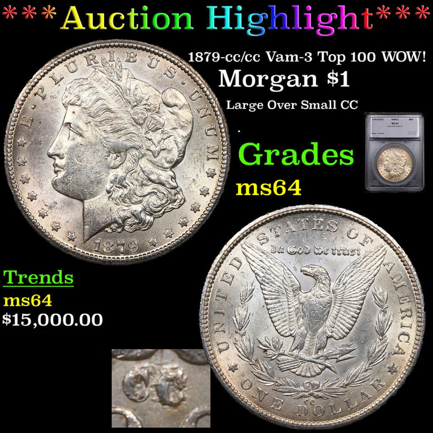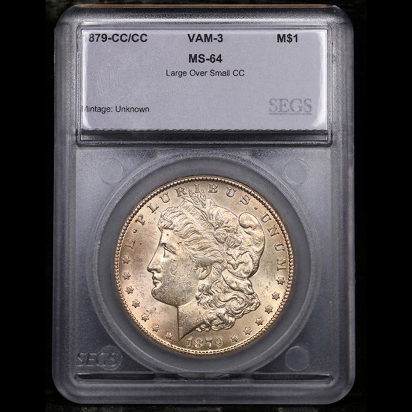 ***Auction Highlight*** 1879-cc/cc Vam-3 Top 100 WOW! Morgan Dollar $1 Graded ms64 BY SEGS. Largely known as the Capped Die, the 1879-CC Large CC Over Small CC variety is actually an overmintmark. The reverse die was first affixed with the small CC as used in the production of the 1878-CC Morgan dollar. This small CC was later partially effaced and a larger CC was entered in its place. Still later, the die acquired a considerable amount of rust in the mintmark area, and all known 1879-CC Capped Die Morgans display the effects around the CC. Since this variety has also been described as the Broken CC, the 1879-CC Capped Die has garnered quite a bit of negative press over the years. This is unfortunate, since the Capped Die is actually scarcer than its Perfect CC counterpart in all grades. Nowhere is this discrepancy more marked than at the higher Mint State levels of preservation. This is a noteworthy example perfect for an advanced Morgan dollar set. A Key Date's Pick, Bid to Win, Don't let it get Away, you might not find its equal Coin. I give this coin my highest recommendation