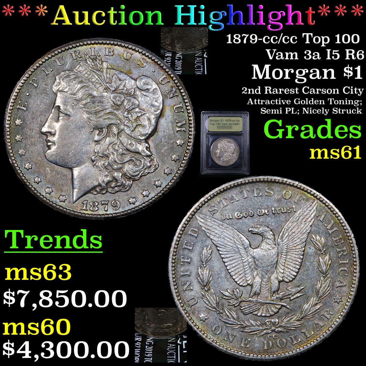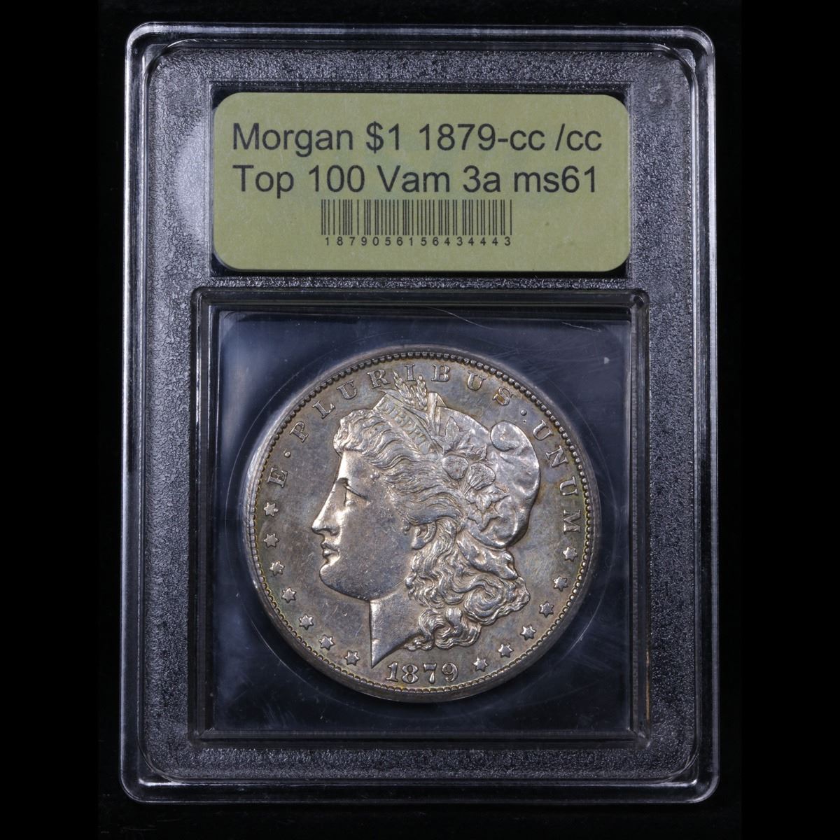 ***Auction Highlight*** 1879-cc /cc Top 100 Vam 3a I5 R6 Morgan Dollar $1 Graded BU+ By USCG. Attractive golden toning highlight these semi proof like fields on this second scarcest Carson City Morgan. Attractive eye appeal, nicely struck. A great find for the high end Morgan Collector. A Corey's Pick, Bid to Win, Don't let it get Away, you might not find its equal Coin. I give this coin my highest recommendation