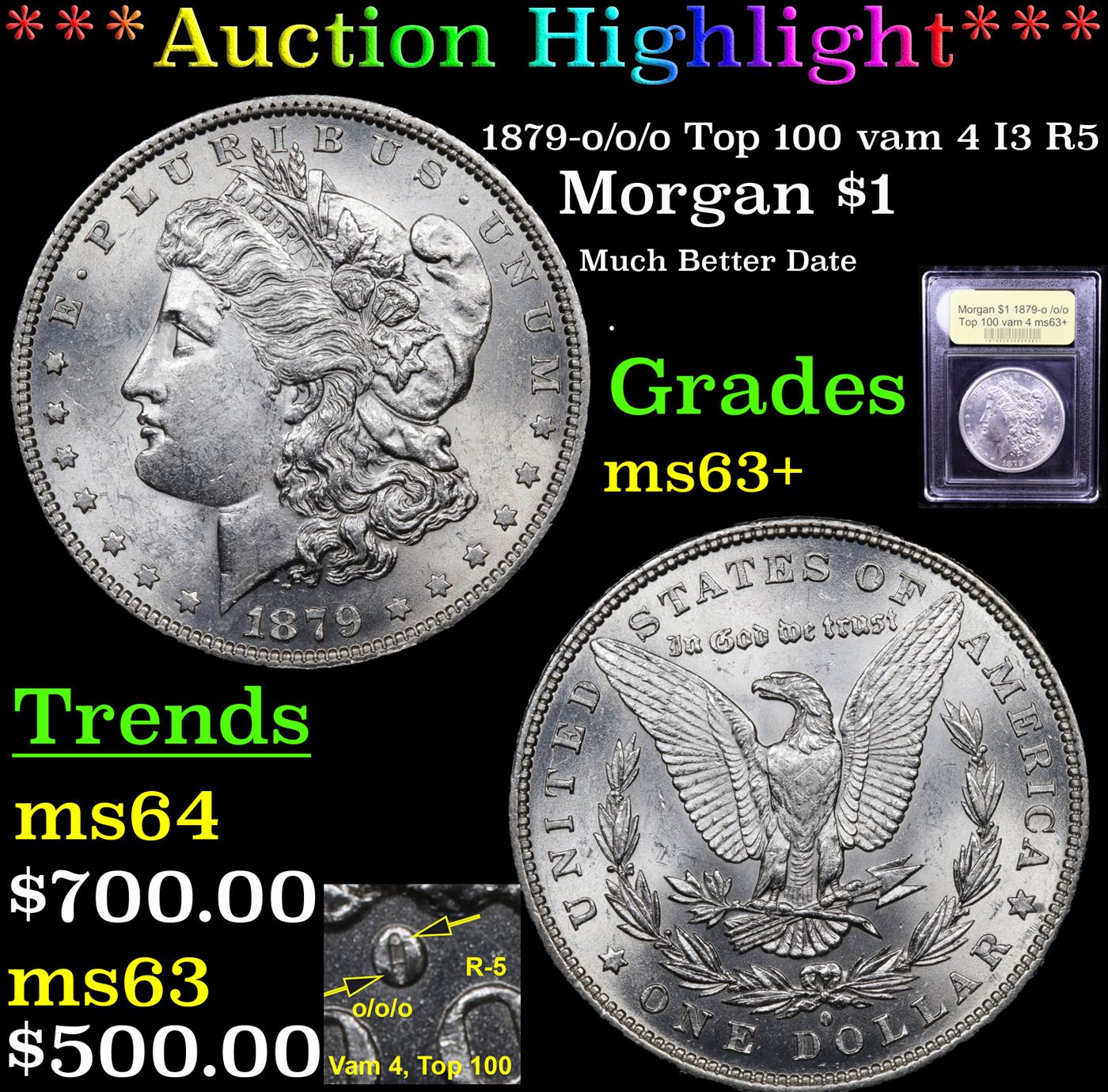***Auction Highlight*** 1879-o /o/o Top 100 vam 4 I3 R5 Morgan Dollar $1 Graded Select+ Unc By USCG. Up for Auction is a scarce 1879-o, Top 100, Vam 4, o/o/o. A wild multiple repunched mintmark. In 1879, the New Orleans mint struck Morgan dollars with an unusual mintmark feature, making this particular coin highly desirable and collectable today. The working dies used to create these dollars had the mintmarks hand stamped into them before the final hardening process. This manual creation process led to the formation of many interesting varieties. Some Morgans have their mintmarks set high. Other mintmarks are set low or tilted. In the instance of this 1879-O Vam 4 variety, the mintmark was punched over 2 other versions of the mintmark, one high and one low, creating an interesting underlying marker. A Corey's Pick, Bid to Win, Don't let it get Away Coin