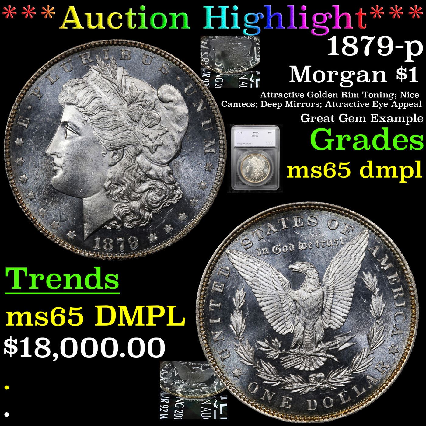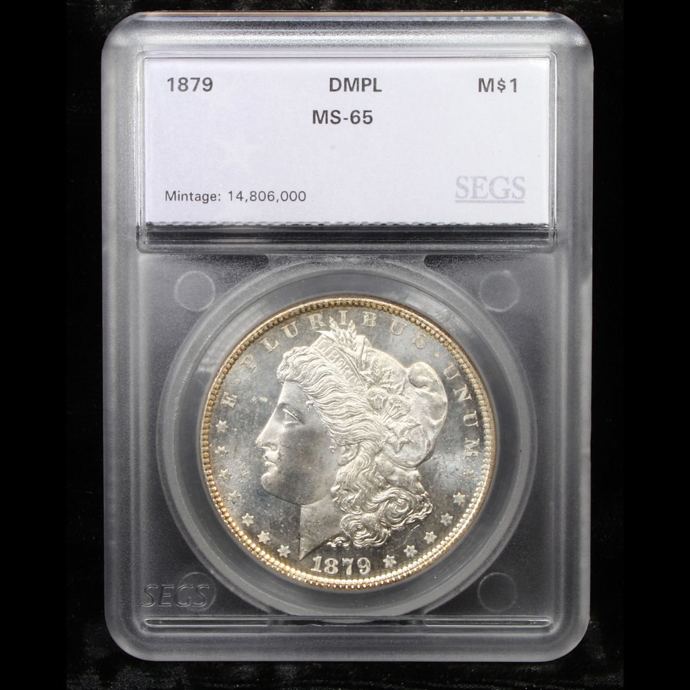 ***Auction Highlight*** 1879-p Morgan Dollar $1 Graded ms65 dmpl By SEGS. This remarkable strike rarity is sure to appeal to advanced collectors of proof like Morgan dollars. Satiny in texture with razor sharp definition, the devices appear to float atop the reflective fields. Both sides are fully brilliant and expertly preserved allowing ready appreciation of this bold cameo contrast.