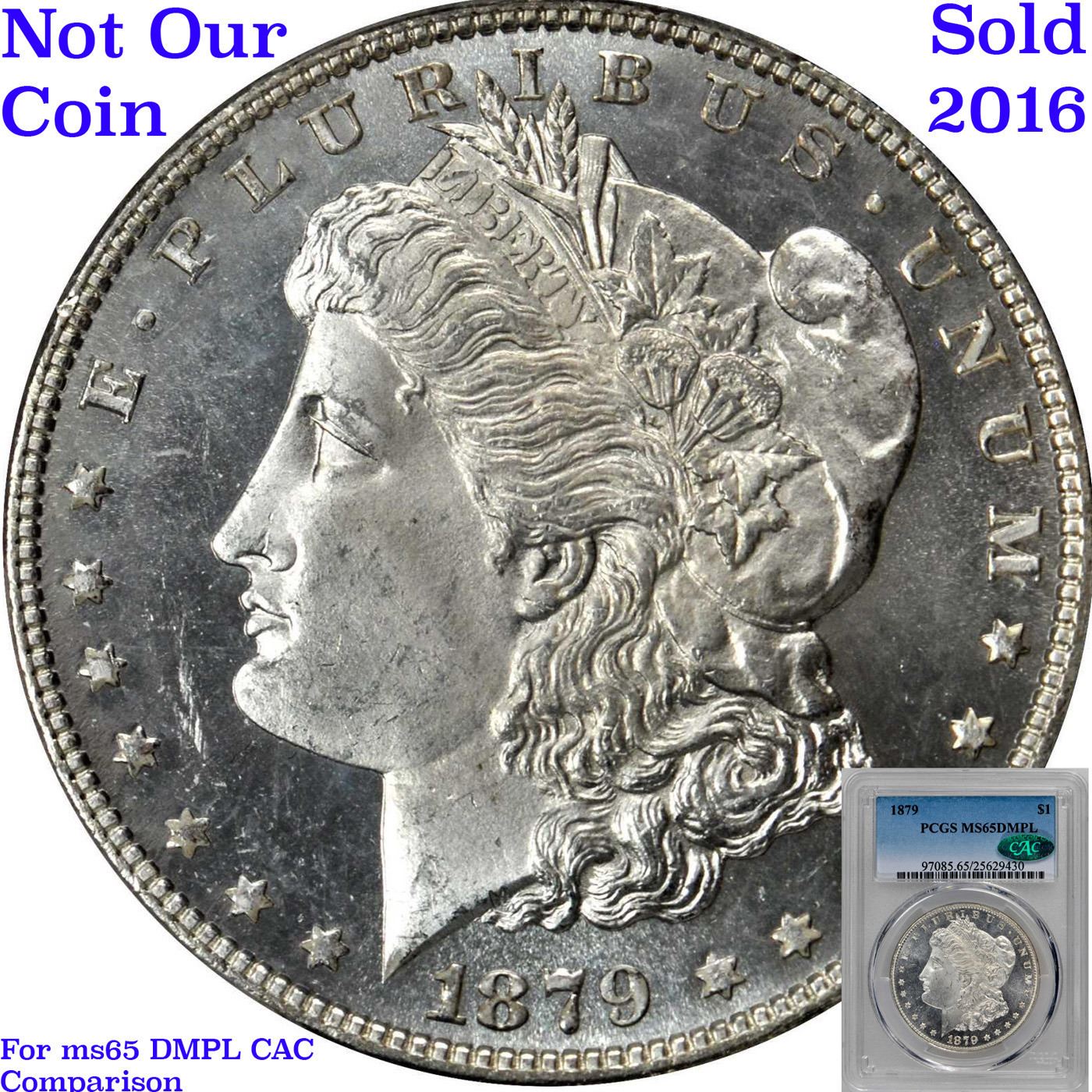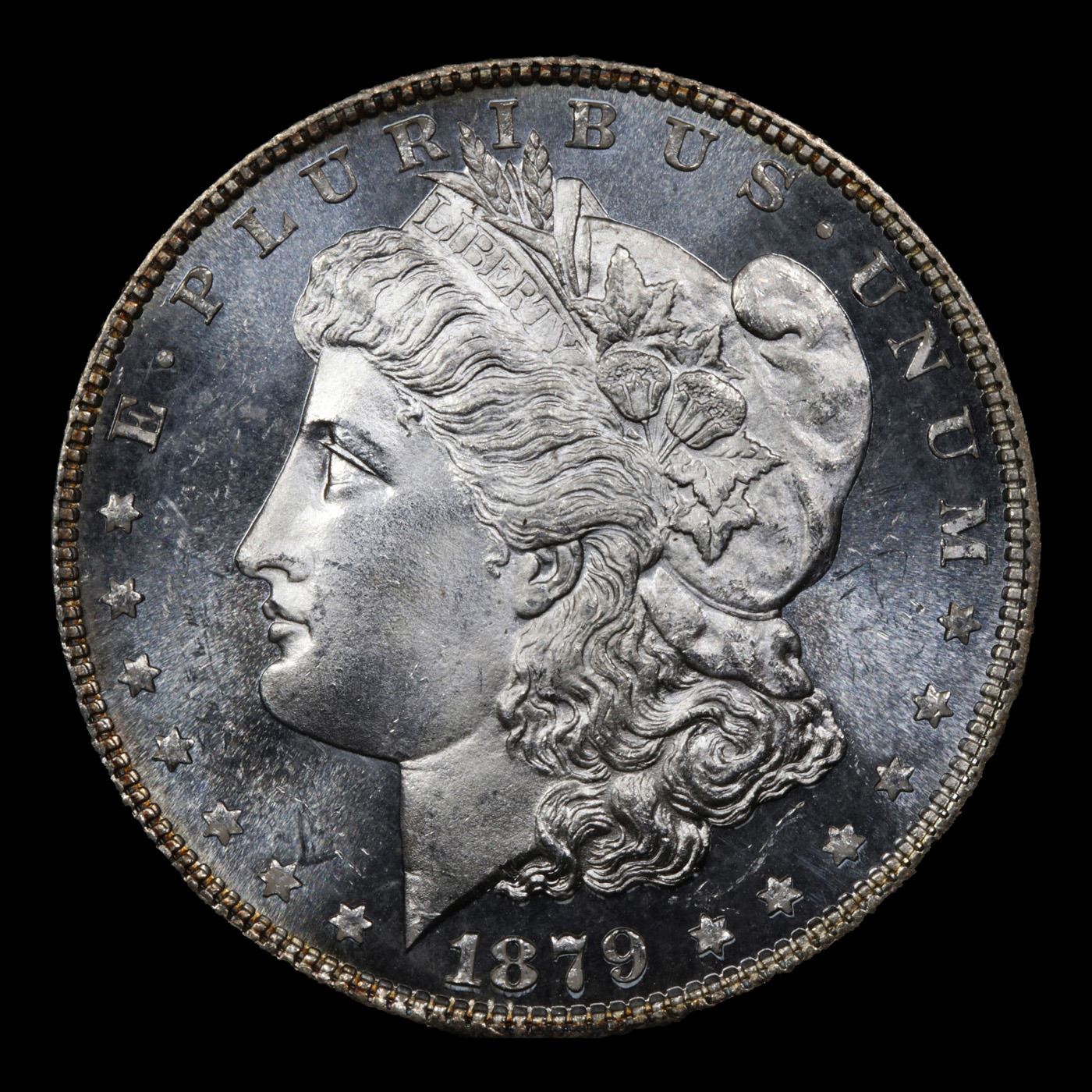 Certainly obtainable in an absolute sense, the 1879 is surprisingly scarce in DMPL. Indeed, many proof like examples are reflective on only one side of the coin, usually the obverse, and the fields tend to be "cloudy" with limited depth to the reflectivity. Writing in the 1993 reference Silver Dollars & Trade Dollars of the United States: A Complete Encyclopedia, however, Q. David Bowers references a small group of high quality cameo proof like 1879 dollars that entered the numismatic market in 1977 through a San Francisco dealer. The number of coins involved in that dispersal was apparently limited, and they have long since been absorbed by the market. We do not know if the present example was part of that group, but it is certainly an exceptionally well produced and fully deep mirror proof like. Beautiful and conditionally rare, and worthy of strong bids. A Corey's Pick, Bid to Win, Don't let it get Away, you might not find its equal Coin. I give this coin my highest recommendation