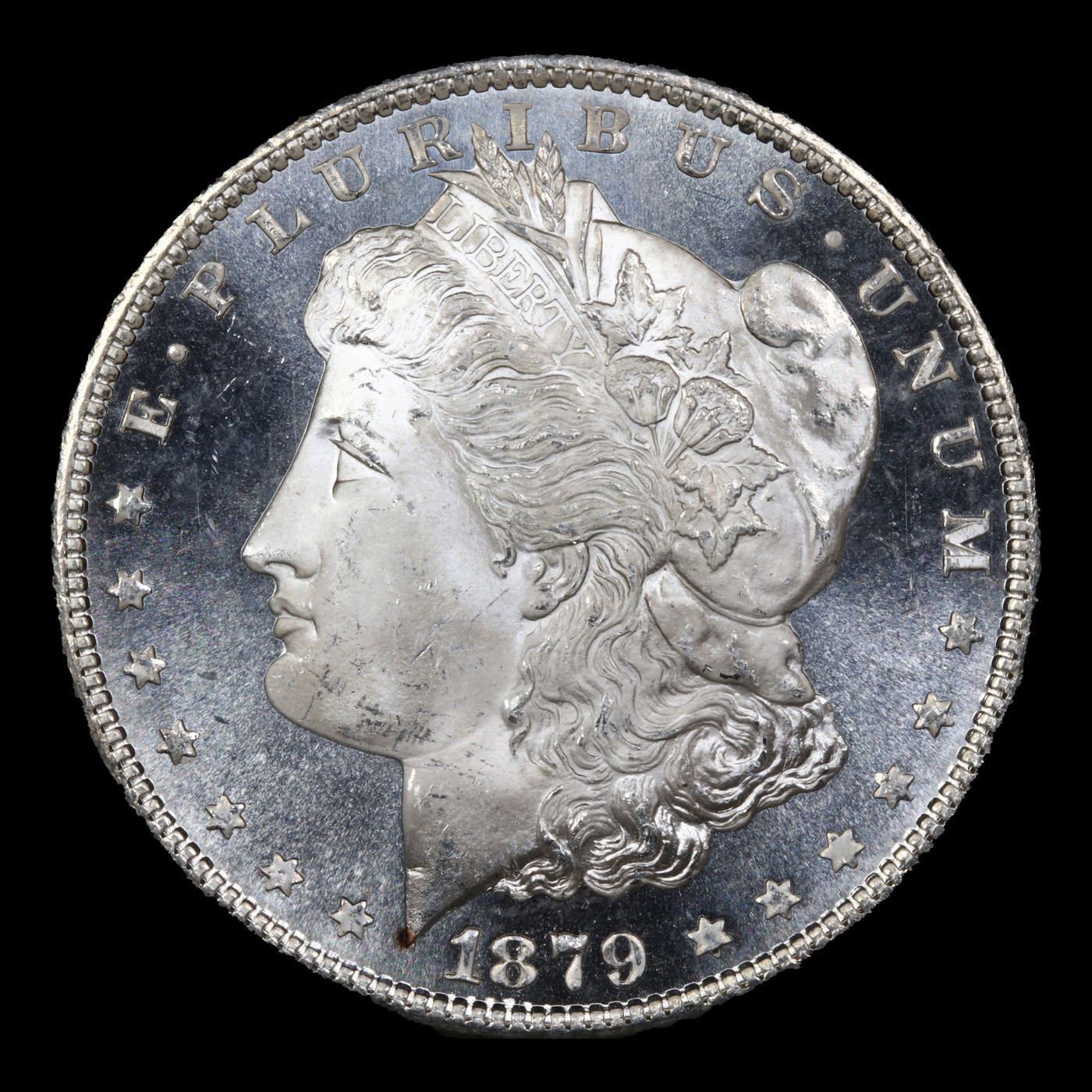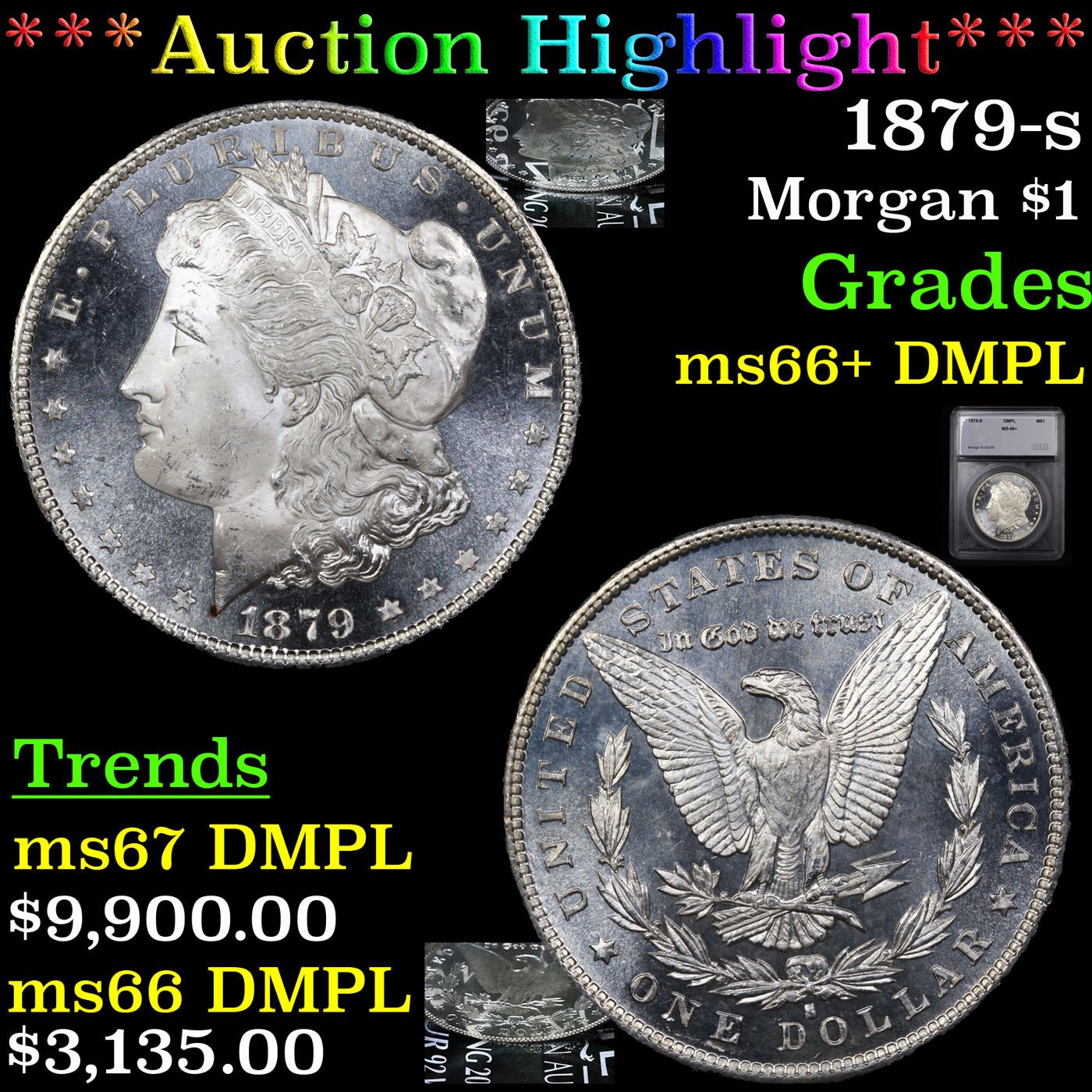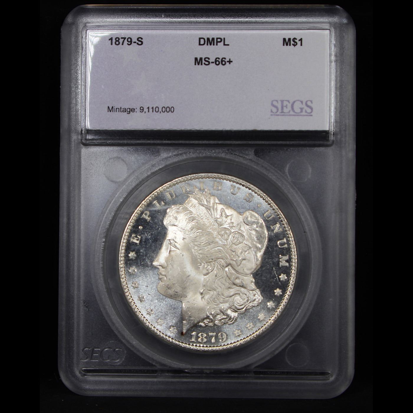 ***Auction Highlight*** 1879-s Morgan Dollar $1 Graded ms66+ DMPL By SEGS. Within ½ a point of the Finest Known! A surprising number of Deep Mirror Prooflike examples have been designated as such for this second-year San Francisco Mint issue, in grades up to and including MS65. At MS66, however, DMPLs are scarce, and at MS67 they are rare, with just 12 such coins certified by the three services combined. This piece is a stunning representative, with white-on-black contrast on both sides so intense that it will impress even the most experienced Morgan dollar specialist. This piece is fully struck on both sides and brilliant on the obverse, with a light coating of gold patina on the reverse. The surfaces are well preserved and minimally marked throughout, in keeping with the grade. A great coin in every respect. Among the Finest Known. A Corey's Pick, Bid to Win, Don't let it get Away, you might not find its equal Coin. I give this coin my highest recommendation