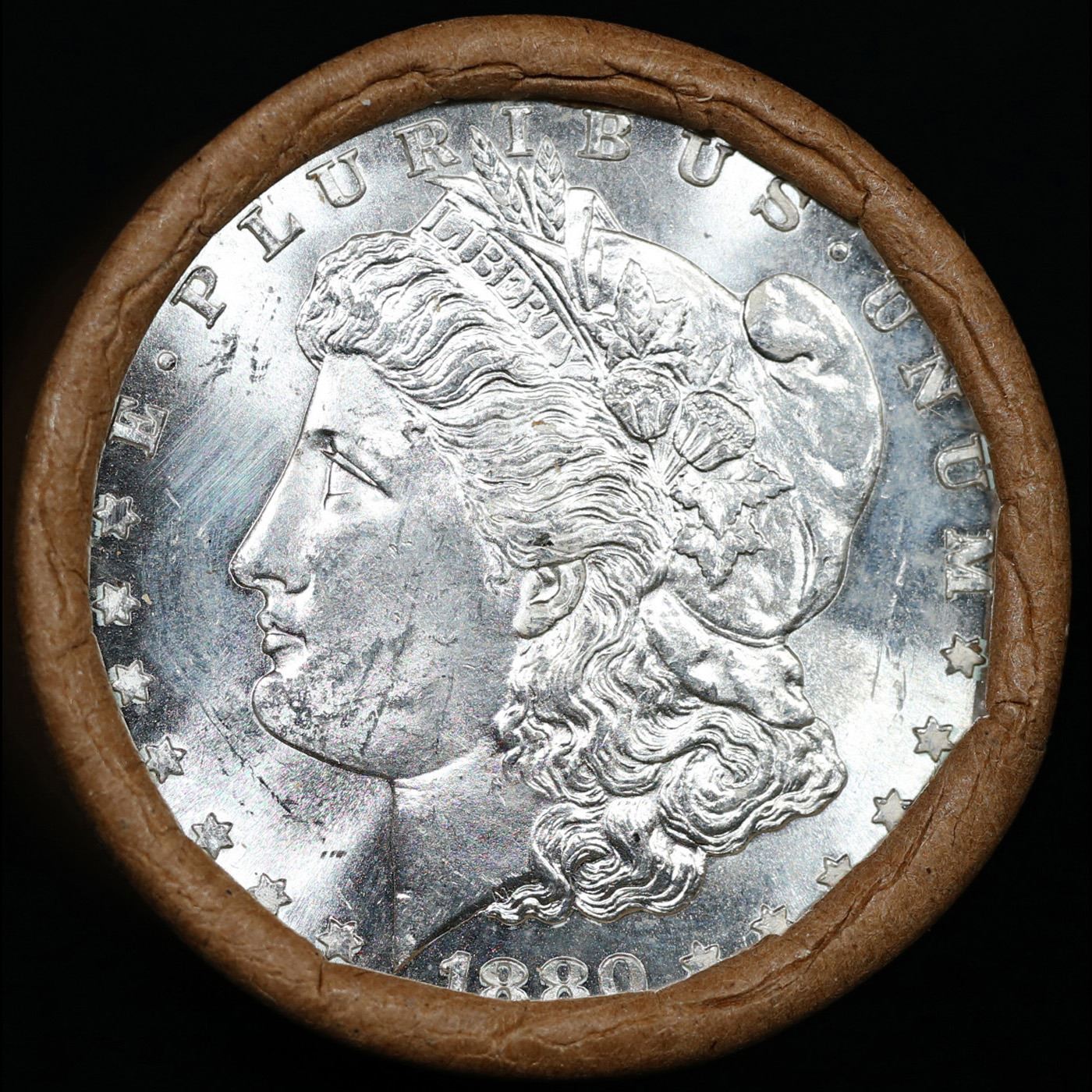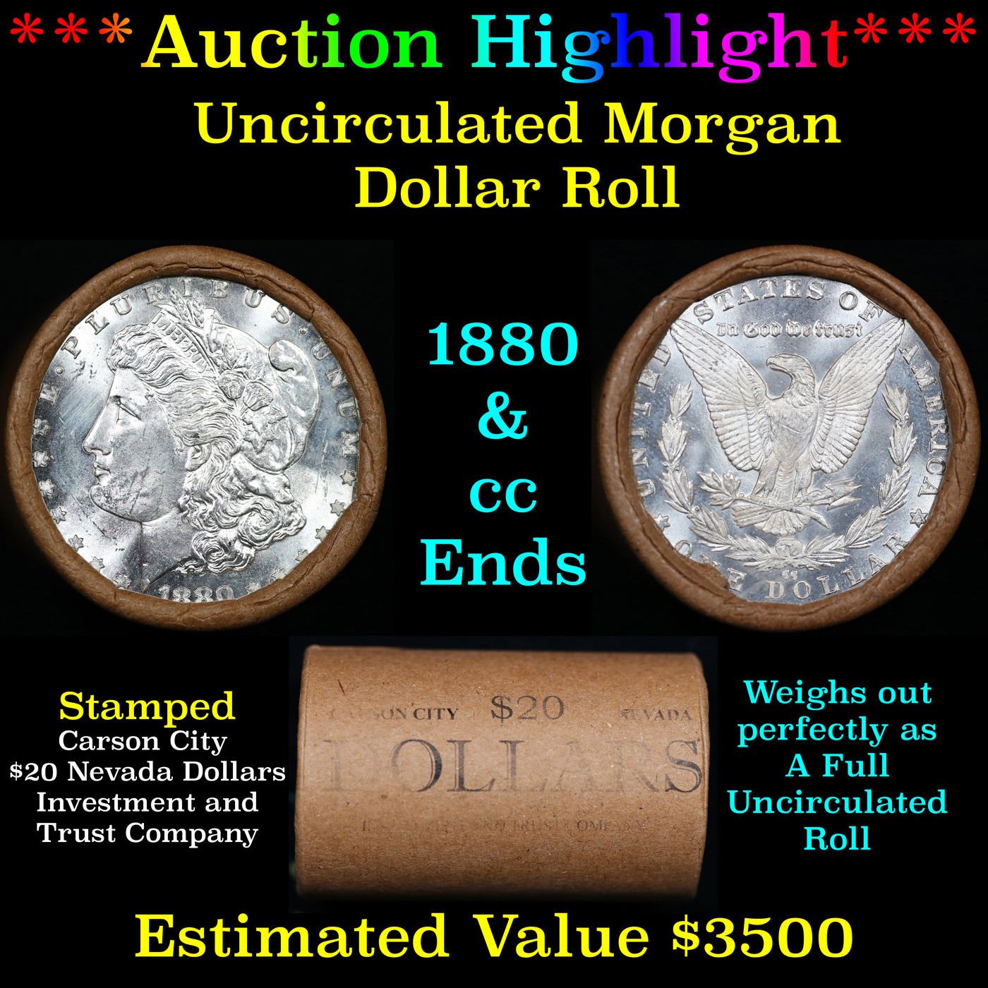 ***Auction Highlight*** 1880 & CC Uncirculated Morgan Dollar Shotgun Roll. 0 Uncirculated Morgan Dollar Roll, Superb Ends, Carson City, Nevada Investment and Trust Co wrapper. Weighs Perfectly as a Uncirculated Roll.