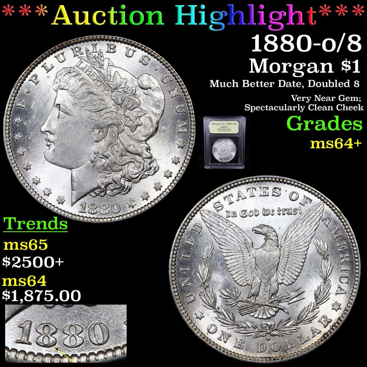 ***Auction Highlight*** 1880-o/8 Much Better Date, Doubled 8 Very Near Gem; Spectacularly Clean Cheek Morgan Dollar $1 Graded Choice+ Unc By USCG. A Corey's Pick, Bid to Win, Don't let it get Away Coin