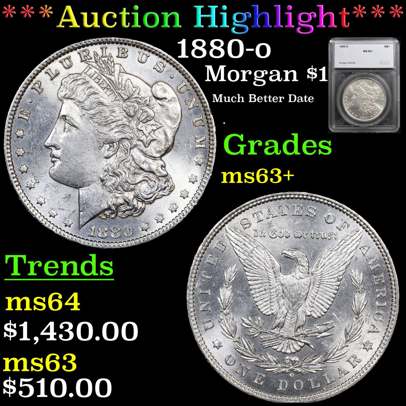 ***Auction Highlight*** 1880-o Morgan Dollar $1 Graded ms63+ By SEGS.