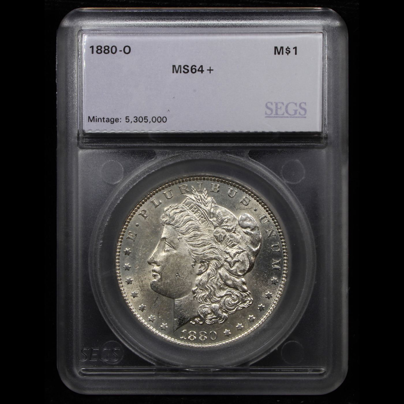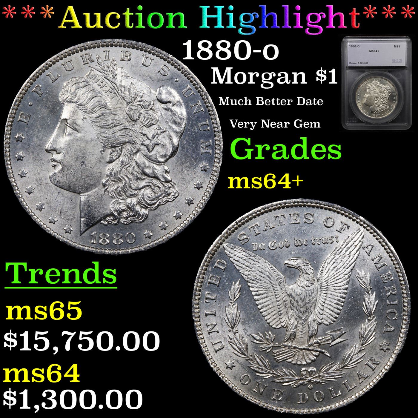 ***Auction Highlight*** 1880-o Morgan Dollar $1 Graded ms64+ By SEGS. A bright, brilliant and beautiful near-Gem with smartly impressed design elements and abundant mint luster. Although not widely represented in the Treasury Department silver dollar releases of 1962 to 1964, enough 1880-O Morgan dollars were released in earlier years to make this a readily obtainable issue in all but the finest Mint State grades. However, in certified MS-65 and higher grades, the 1880-O is the scarcest Morgan dollar issue produced up to that point in time. Clearly this premium quality MS-64+ represents excellent value for the astute bidder.