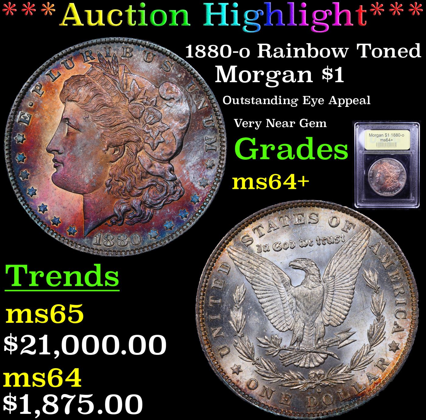 ***Auction Highlight*** 1880-o Rainbow Toned Morgan Dollar $1 Graded Choice+ Unc By USCG. This radiant, rainbow toned near Gem has incredible eye appeal and is incredibly lustrous. The fields offer an intensely satiny complexion, subtly contrasting the more frosty design elements. Though plentiful in AU, the 1880-O is scarce in ms60-62 and rare in ms63-ms64 and a severe condition rarity in Gem and above. A Corey's Pick, Bid to Win, Don't let it get Away, you might not find its equal Coin. I give this coin my highest recommendation