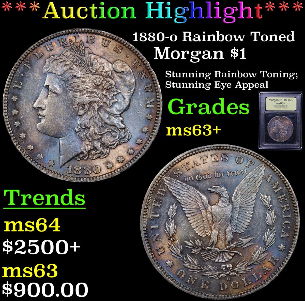 ***Auction Highlight*** 1880-o Rainbow Toned Morgan Dollar $1 Graded Select+ Unc By USCG. A Corey's Pick, Bid to Win, Don't let it get Away Coin