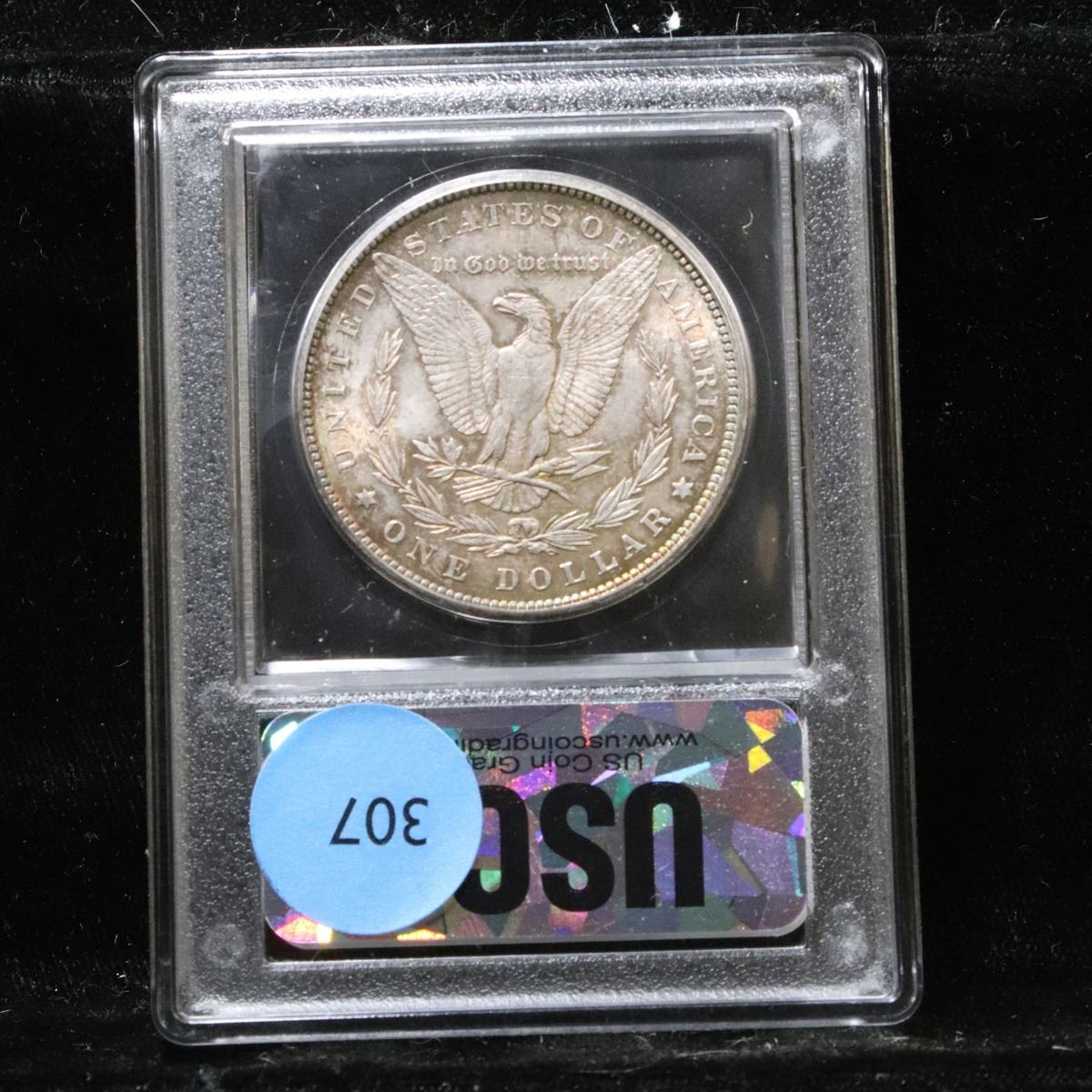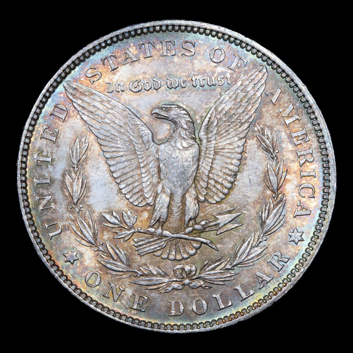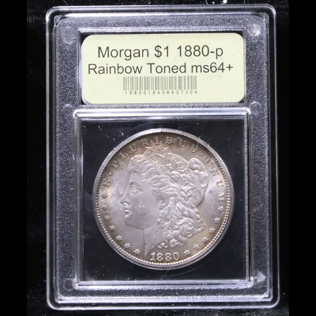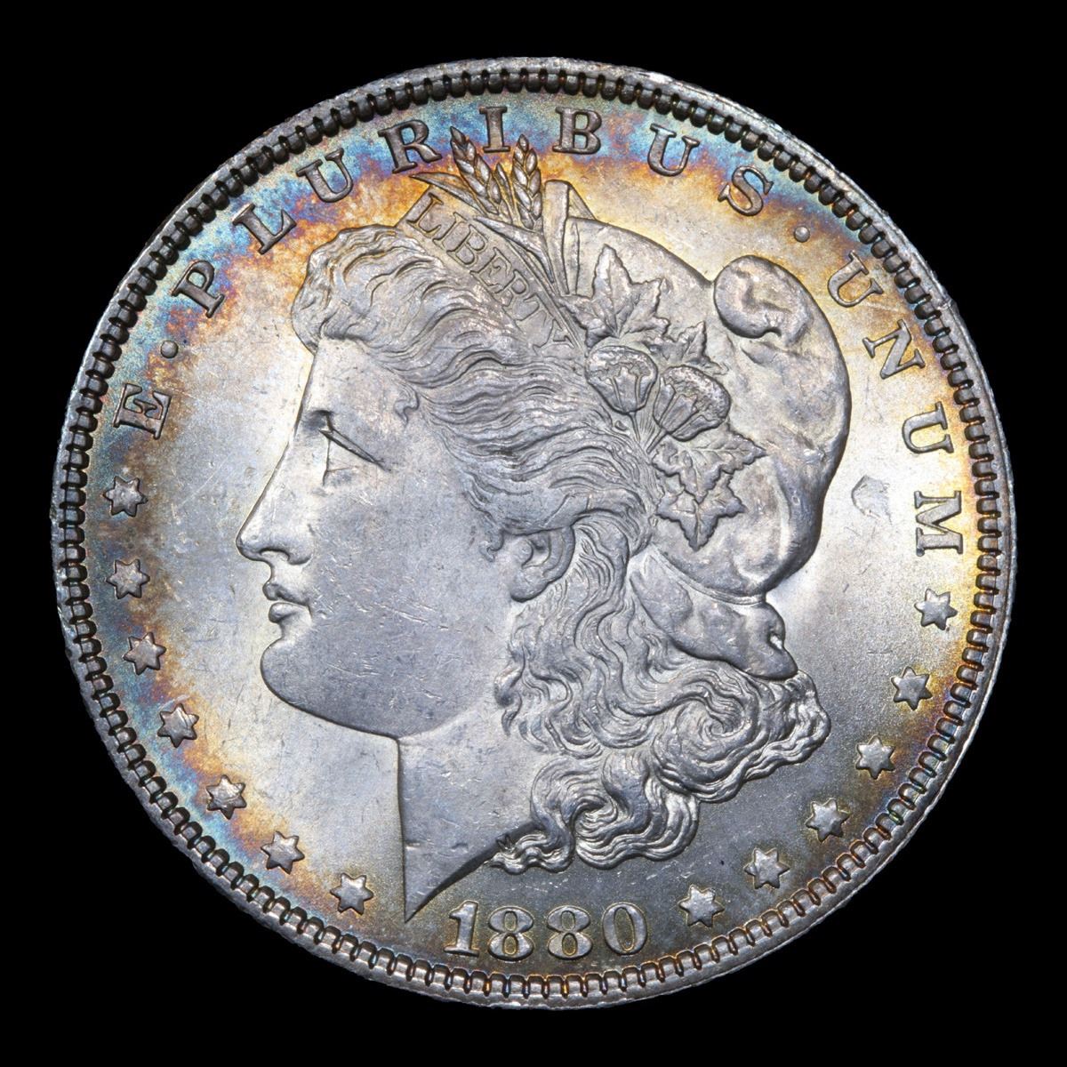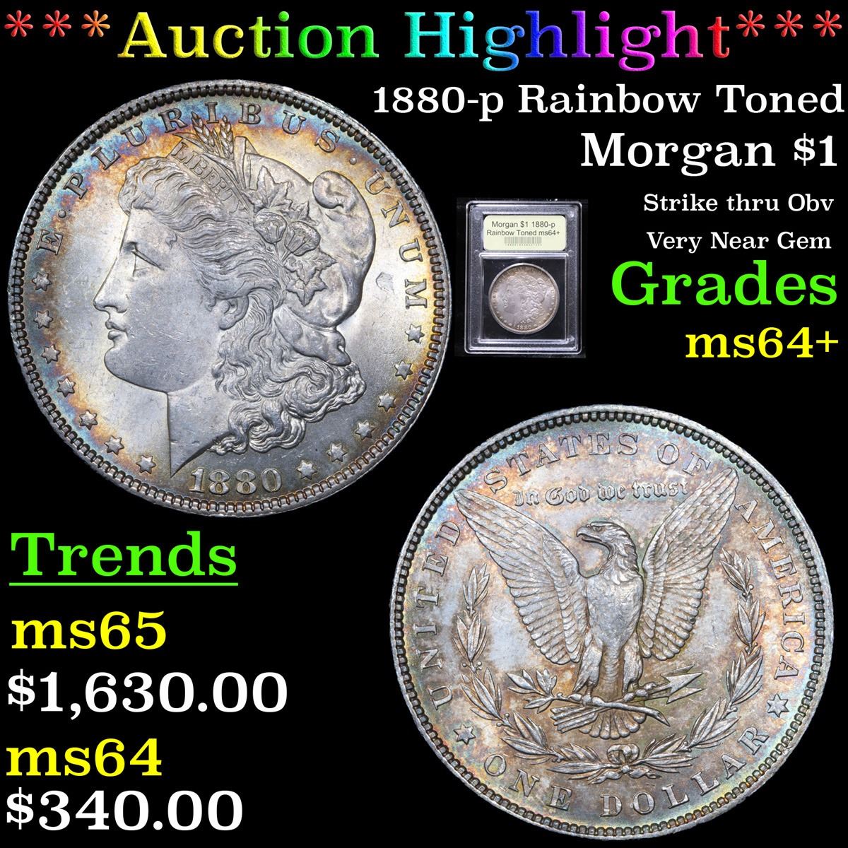 ***Auction Highlight*** 1880-p Rainbow Toned Strike thru Obv Very Near Gem Morgan Dollar $1 Graded Choice+ Unc By USCG. A Corey's Pick, Bid to Win, Don't let it get Away Coin