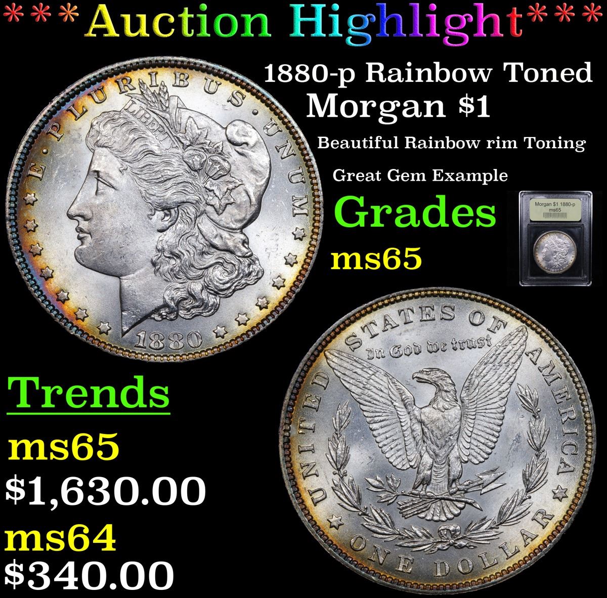 ***Auction Highlight*** 1880-p Rainbow Toned Morgan Dollar $1 Graded GEM Unc By USCG. A Corey's Pick, Bid to Win, Don't let it get Away, you might not find its equal Coin