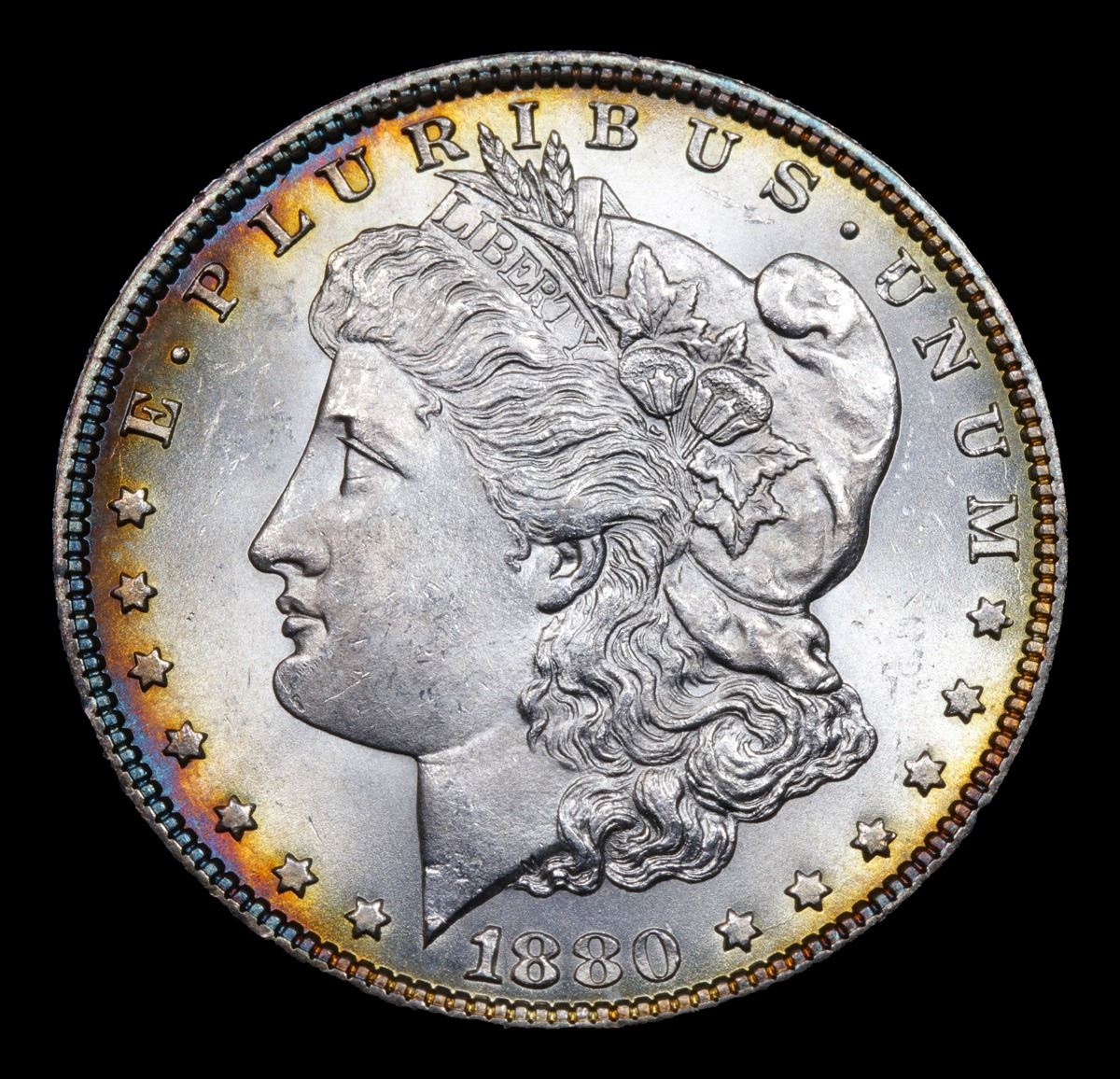 ***Auction Highlight*** 1880-p Rainbow Toned Morgan Dollar $1 Graded GEM Unc By USCG (fc)