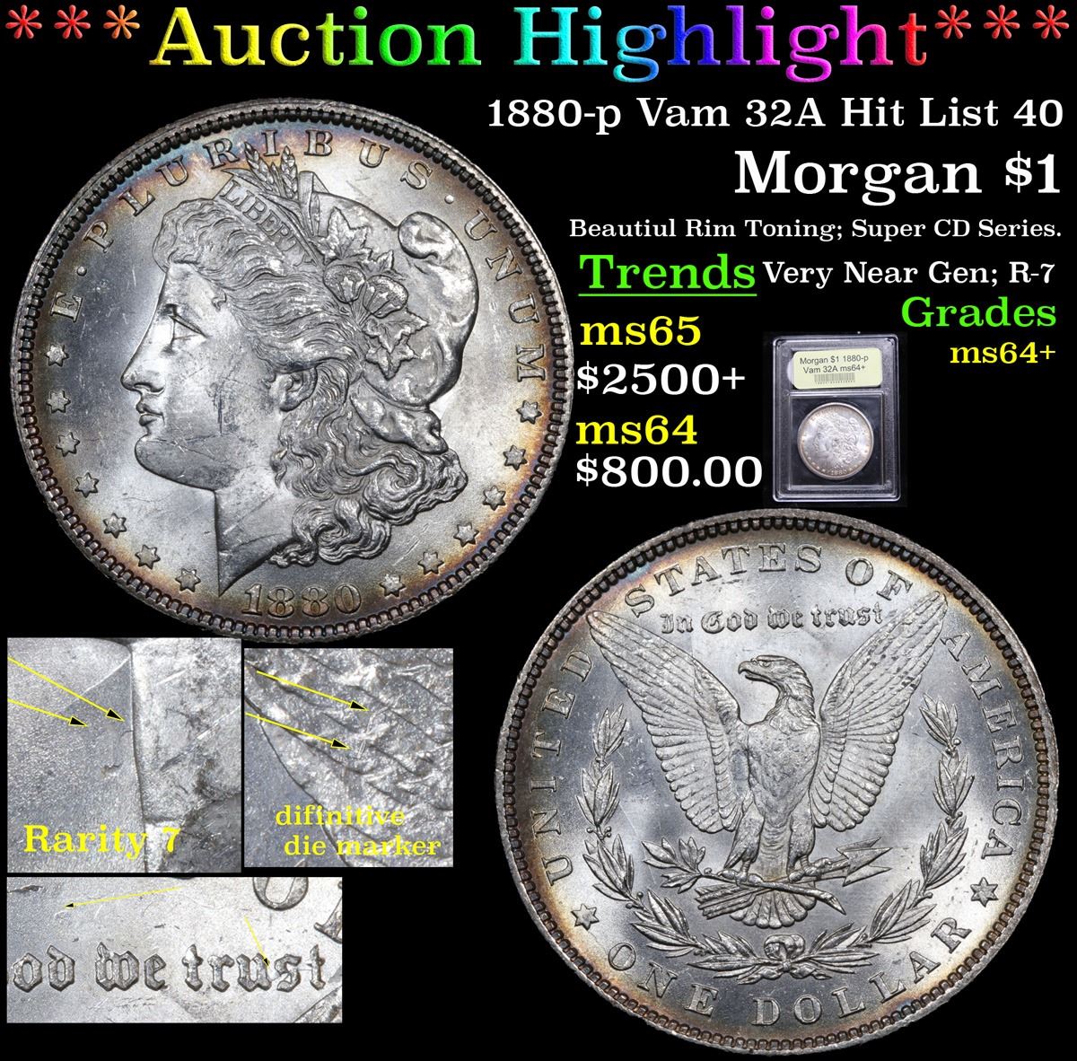 ***Auction Highlight*** 1880-p Vam 32A Hit List 40 Beautiul Rim Toning; Super CD Series. Very Near Gen; R-7 Morgan Dollar $1 Graded Choice+ Unc By USCG. First One We've ever sold. Doubled Date Clashed Obv IN, 'E UST,' Rev 'M' Very Strong Clashed Die Ultra Rare Late Die State. Less Then 100 Known Rarity 7; A Corey's Pick, Bid to Win, Don't let it get Away, you might not find its equal Coin. I give this coin my highest recommendation
