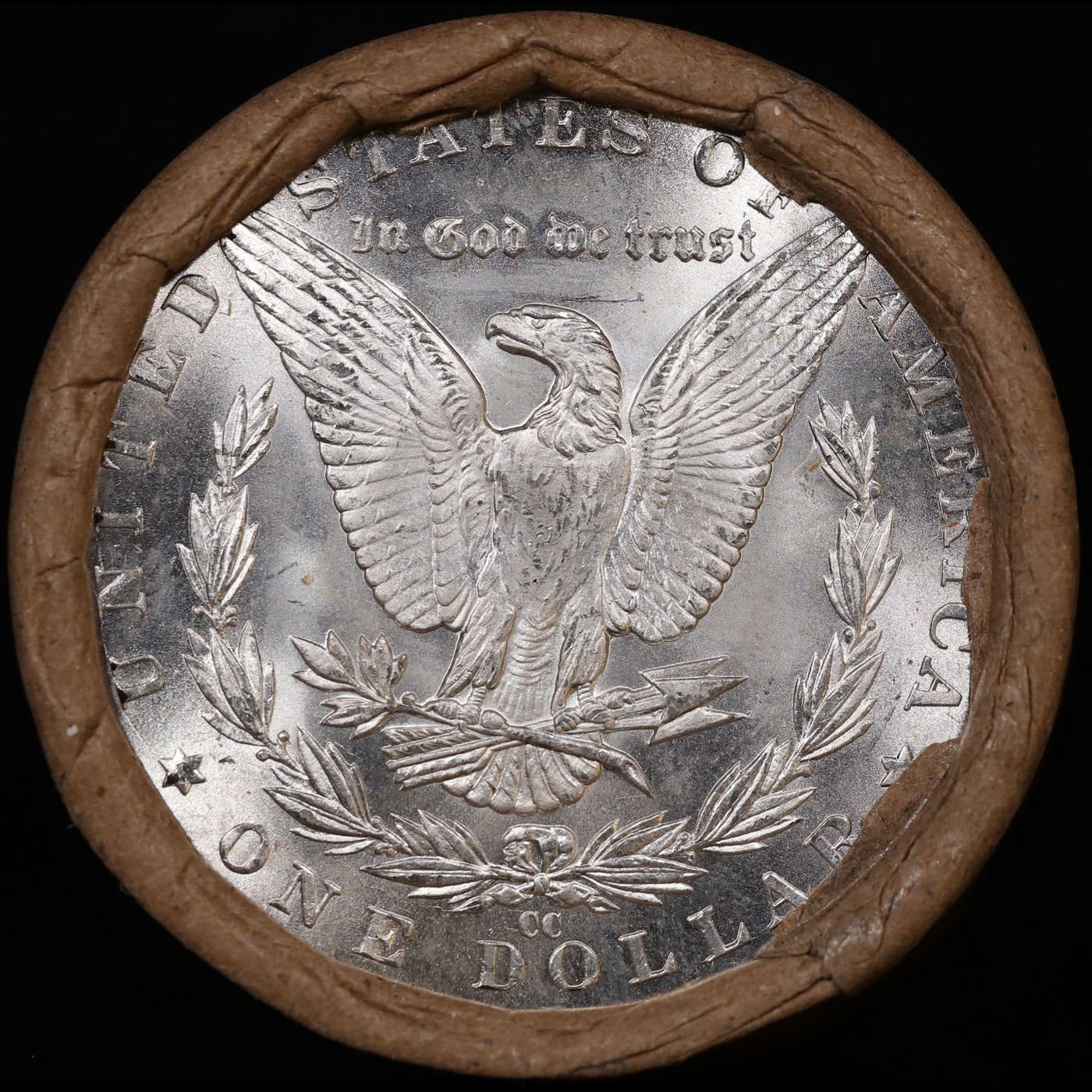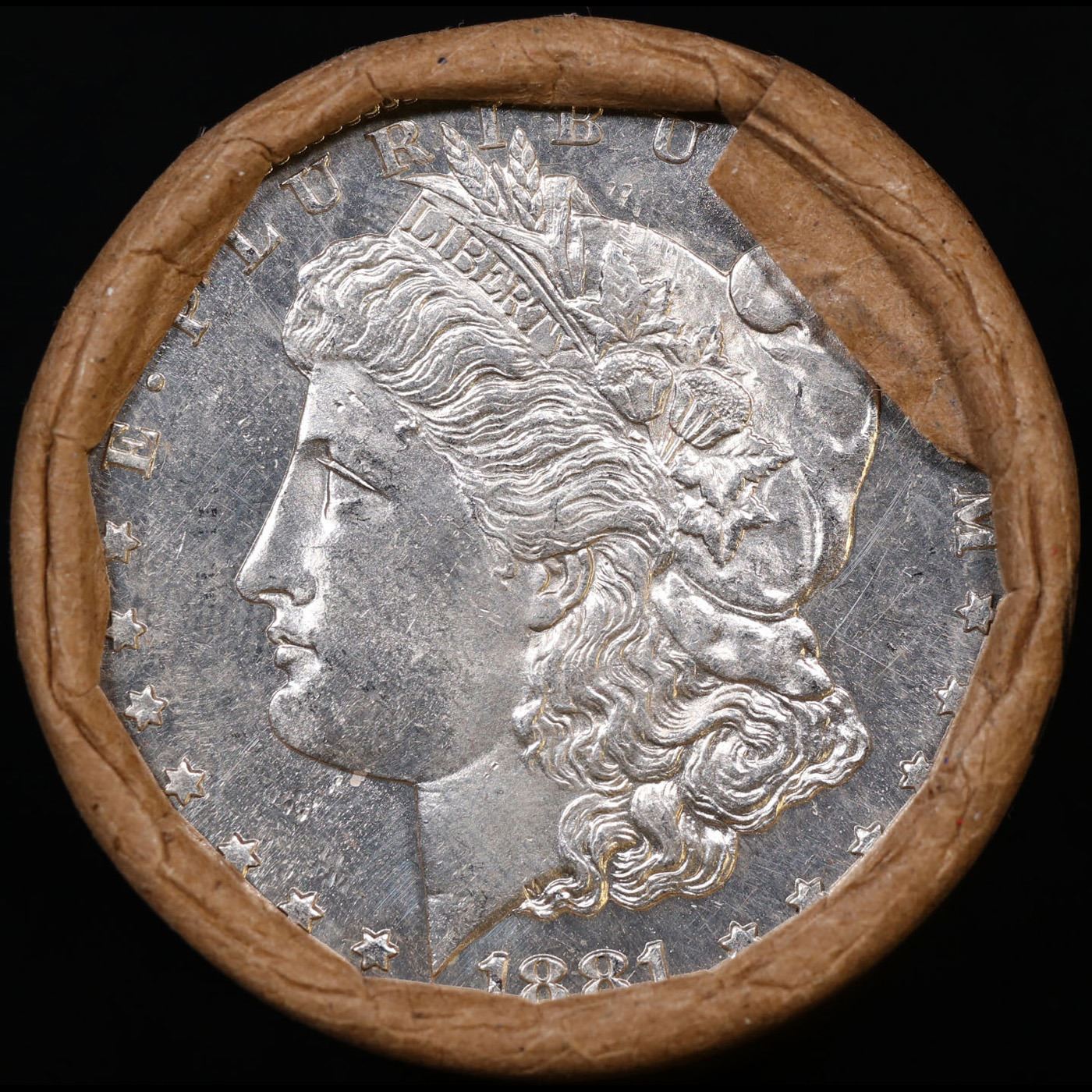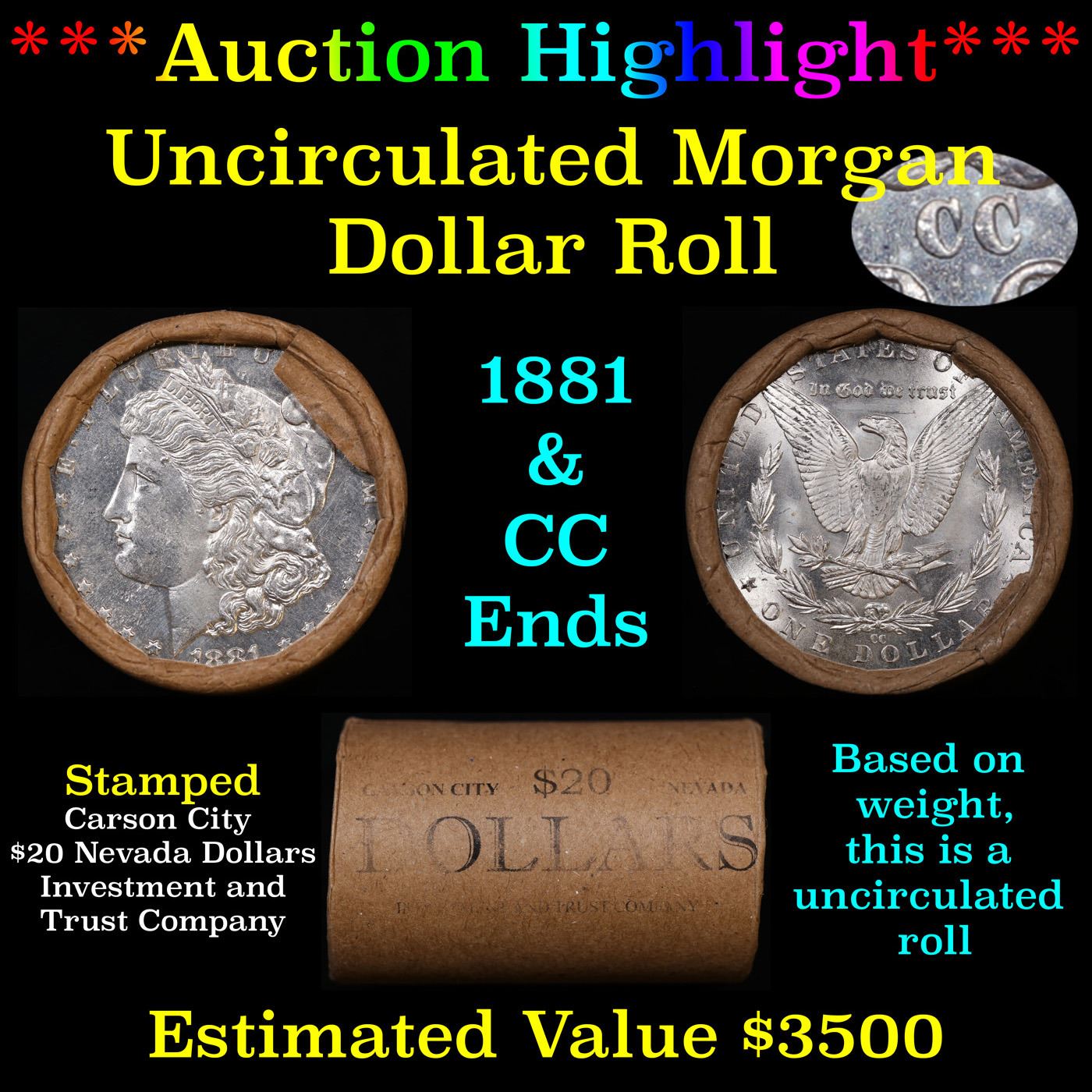 ***Auction Highlight*** 1881 & CC Uncirculated Morgan Dollar Shotgun Roll. Uncirculated Morgan Dollar Roll, Superb Ends, Carson City, Nevada Investment and Trust Co wrapper. Weighs Perfectly as a Uncirculated Roll.