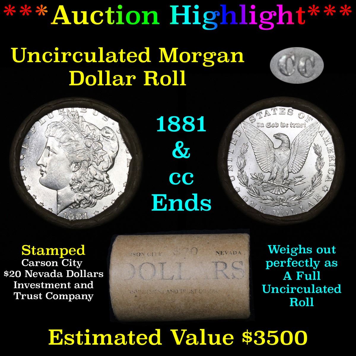 ***Auction Highlight*** 1881 & CC Uncirculated Morgan Dollar Shotgun Roll . .. Uncirculated Morgan Dollar Roll, Superb Ends, Carson City, Nevada Investment and Trust Co wrapper. Weighs Perfectly as a Uncirculated Roll. Great luster and super eye appeal on both ends.