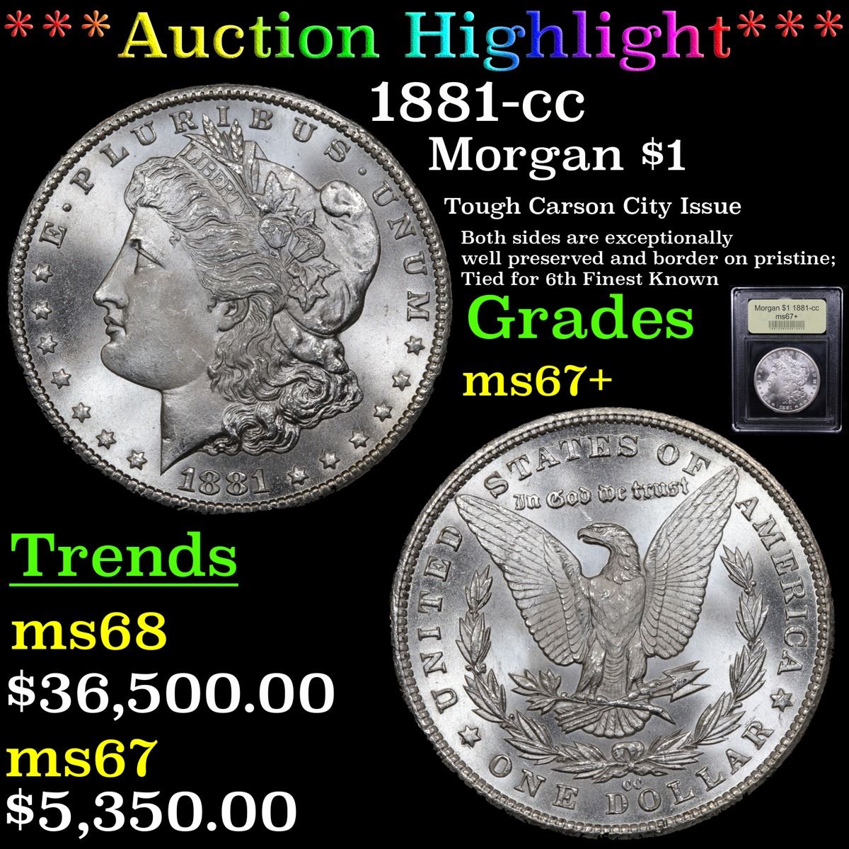 ***Auction Highlight*** 1881-cc Morgan Dollar $1 Graded Gem++ Unc By USCG. Brilliant ice white surfaces are fully struck, as befits the issue, with intense mint luster in a blend of satin and frosty qualities. Both sides are exceptionally well preserved and border on pristine. The 1881-CC boasts the second lowest mintage of all of the Morgan dollar issues struck at the Carson City Mint. Produced to a quantity of just 296,000 pieces, this mintage was considerably scanter than those of the more famous 1889-CC and 1879-CC issues. However, few 1881-CC dollars reached circulation, with most being distributed throughout the 20th century in Treasury Department releases and the GSA sales of the 1970s. While Mint State examples are readily available, most of these are confined to grades of MS-66 and below by bag marks and other minor blemishes. Upper end Superb Gems like the present are rare, highlighting the fleeting nature of this offering for the quality conscious collector. Tied for 6th Finest Known. A Corey's Pick, Bid to Win, Don't let it get Away, you might not find its equal Coin. I give this coin my highest recommendation