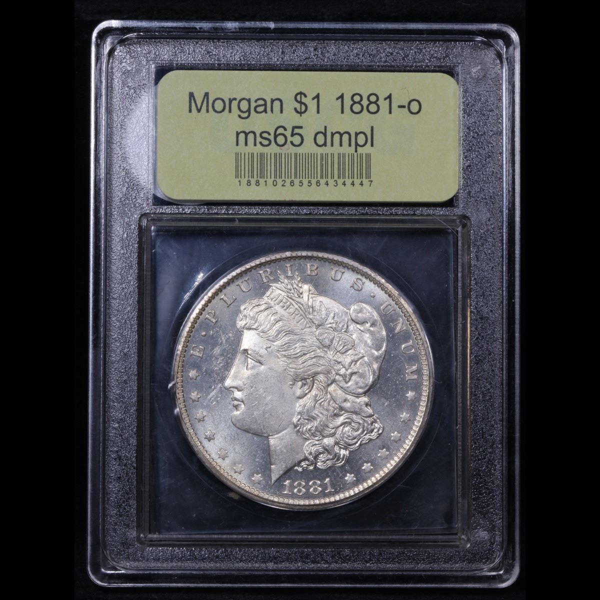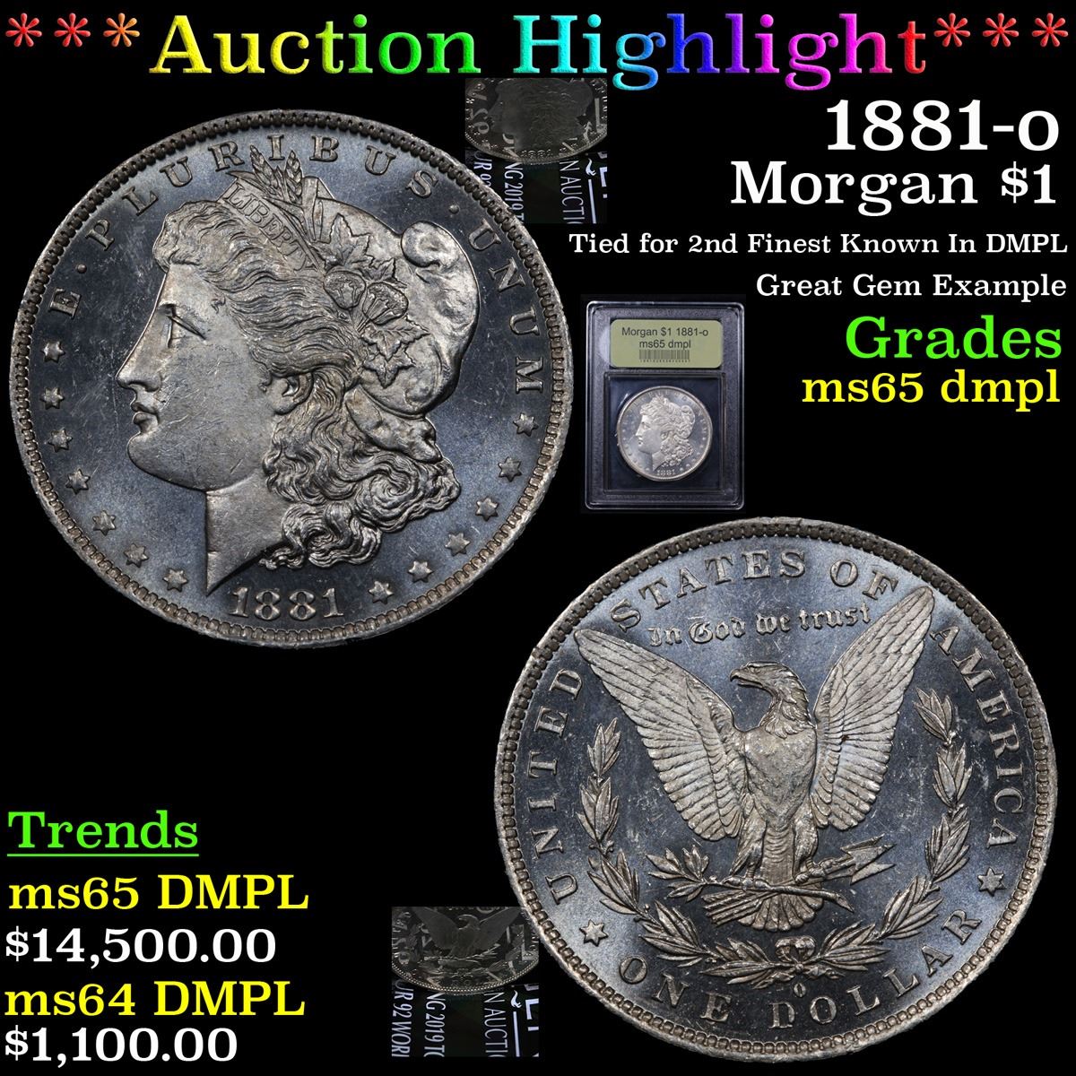 ***Auction Highlight*** 1881-o Morgan Dollar $1 Graded GEM Unc DMPL By USCG. Frosty and fully struck, the devices appear to float atop highly reflective fields. Brilliant surfaces further enhance the eye appeal, and both sides are exceptionally smooth for this conditionally challenging New Orleans Mint issue. Although the 1881-O is fairly plentiful in Mint State, only a small percentage offer richly contrasting Deep Proof like fields. These were usually early strikes from the dies when the dies retained the most polish. While these highly contrasting Morgan dollars have long been popular with collectors, they also attract bag marks in their delicate mirror-like fields, hence high grade Deep Proof like coins are quite elusive of most dates A Corey's Pick, Bid to Win, Don't let it get Away, you might not find its equal Coin. I give this coin my highest recommendation