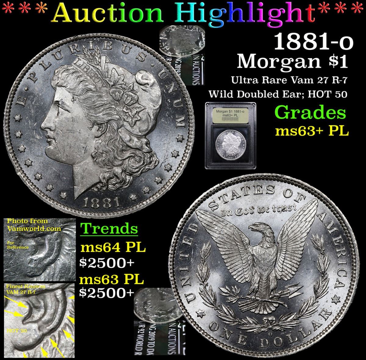 ***Auction Highlight*** 1881-o Morgan Dollar $1 Graded Select Unc+ PL By USCG. HIGHLIGHT OF THE AUCTION, FOR VAM Collectors! Incredible Rarity. We have not offered a Rarity 7 Morgan in Many Many Auctions. A Rarity 7 means less than 50 known. Since it is Also a HOT 50, that means no everyone attempting to collect a full set of the HOT 50, can complete that goal since there are much fewer of this coin than there are collectors trying to complete the HOT 50. Hence the Huge Premium this variety commands. Adfditionally, this great PL example has a DMPL obverse. Last, this is possibly the finest known Vam 27. POSSIBLE TOP POP! VAMVIEW, The VAM Price Guide lists as the highest known grade an ms62 and values it as $1225. In ms62 a regular 1881-o, not PL is $65. That's a 20x Multiplier of Value. A regular ms63+ PL Trends $225. PCGS to date has certified 68 coins as the 1881-o Vam 27, the highest is a single ms63. 0 in PL or DMPL. NGC has certified 35 with the highest as 1 ms63 and none PL or DMPL. We do believe you are looking at the finest known 1881-o Vam 27, Hot 50 A Corey's Pick, Bid to Win, Don't let it get Away, you might not find its equal Coin. I give this coin my highest recommendation